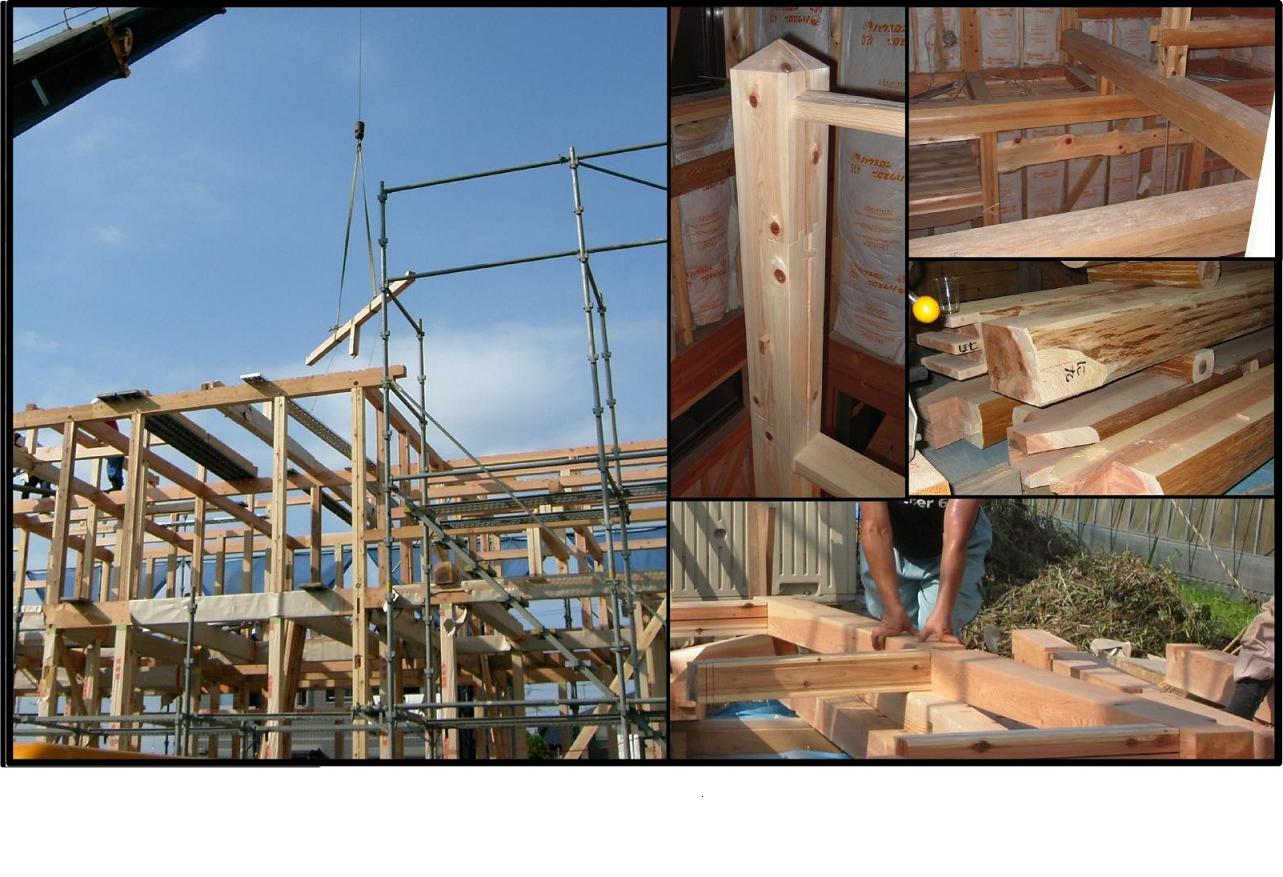 西川材の杉や桧を1年以上寝かせて製材した柱たちです。墨付け、刻み、削りはもちろん、仕口や仕掛け、継手は木材同士が互いに組み合い建物全体を「軟構造」で支えます。既製品や新建材に頼らず出来るだけ「手作り」で仕上げました。もちろん溶剤や化学物質の薬剤は使用しておりません。