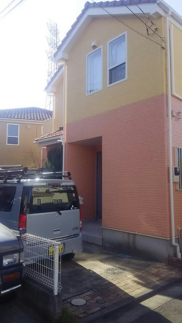 303 色分けサイディング塗装 大越ペイント 1階はタイル模様を生かして目地と塗り分けをおこないました。 ビフォー 場所 川越市 工事概要 外壁、軒、破風、鉄部の塗装。サイディングシーリングの打ち替え。