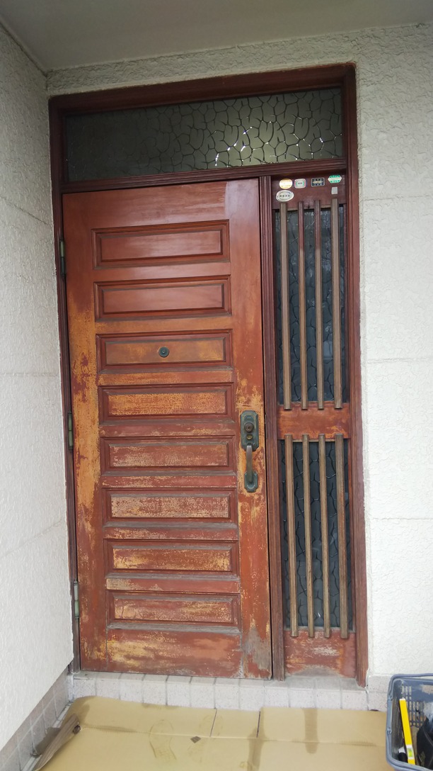 古い木製のドアを木目調のアルミドアに交換しました