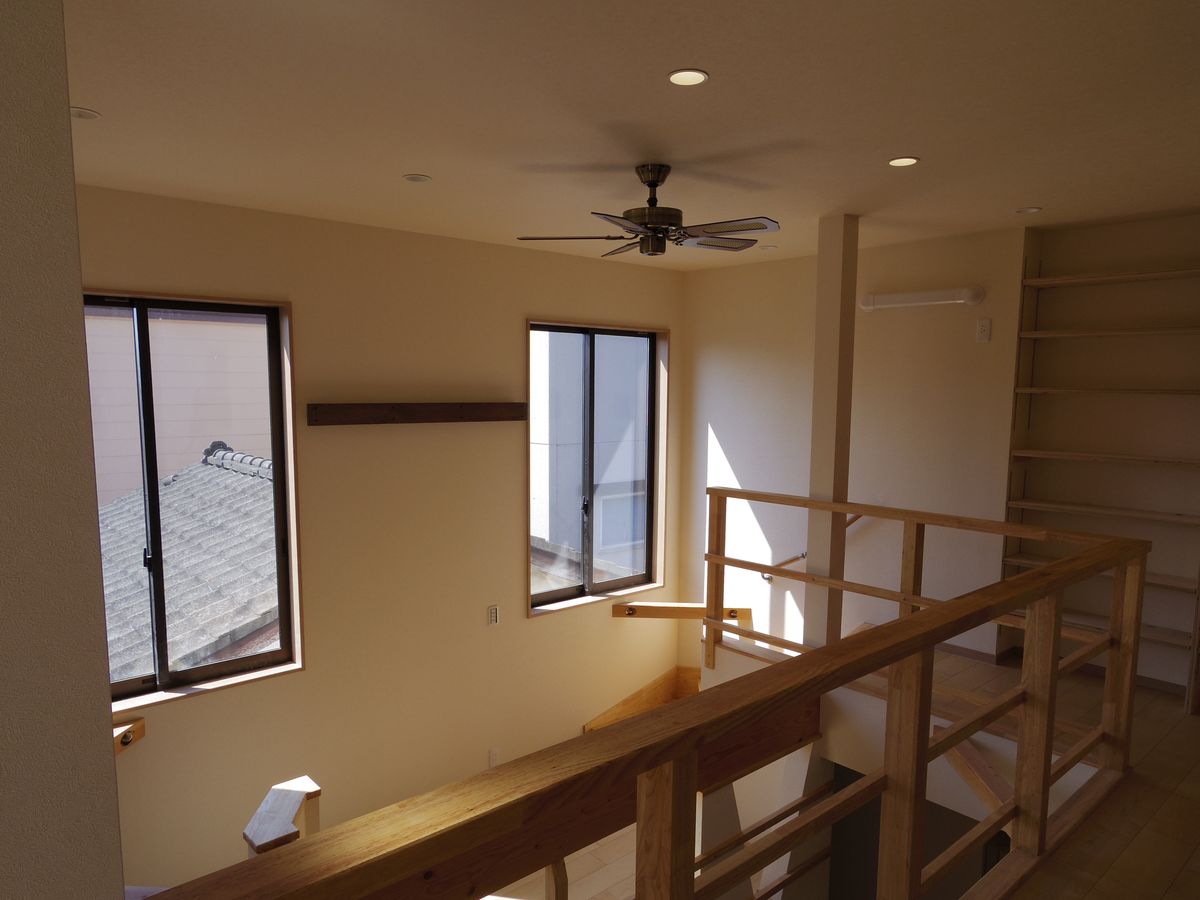 LDKと子供部屋を繋ぐ大きな吹抜け。広い踊場は、子供の遊び場。大きな窓は、自然光を北側のキッチンまで届けてくれます。間仕切りを開閉でき夏と冬で住み方を変化させられるようになっています。