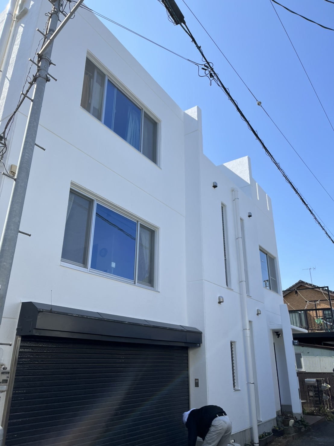 コンクリート住宅の改修工事です。 冬に室内が寒いとの事で お客様からの要望で外壁に断熱塗料を塗装しました。