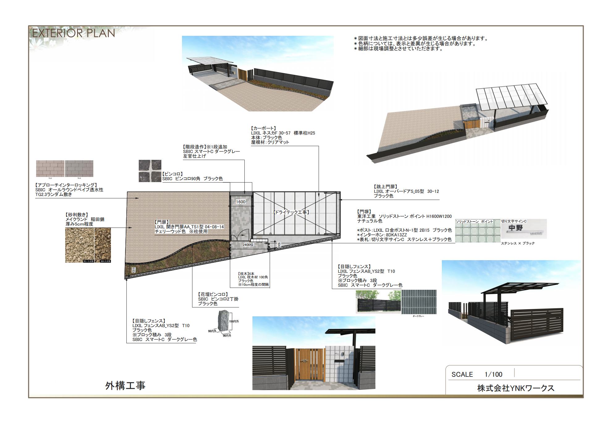 | 補足事項 | 【跳ね上げ門扉】 LIXILオーバードアS05型 【門塀】 東洋工業ソリッドストーン ポイントH1600×w1200 ナチュラル色 【ポスト】 LIXIL 口金ポストN-1型 2B15 ブラック色 【門扉】 LIXIL開き門扉AA-TS1型04・08-14 チェリーウッド色 【枕木】 LIXIL枕木材100角 ブラック色 6本程度 |