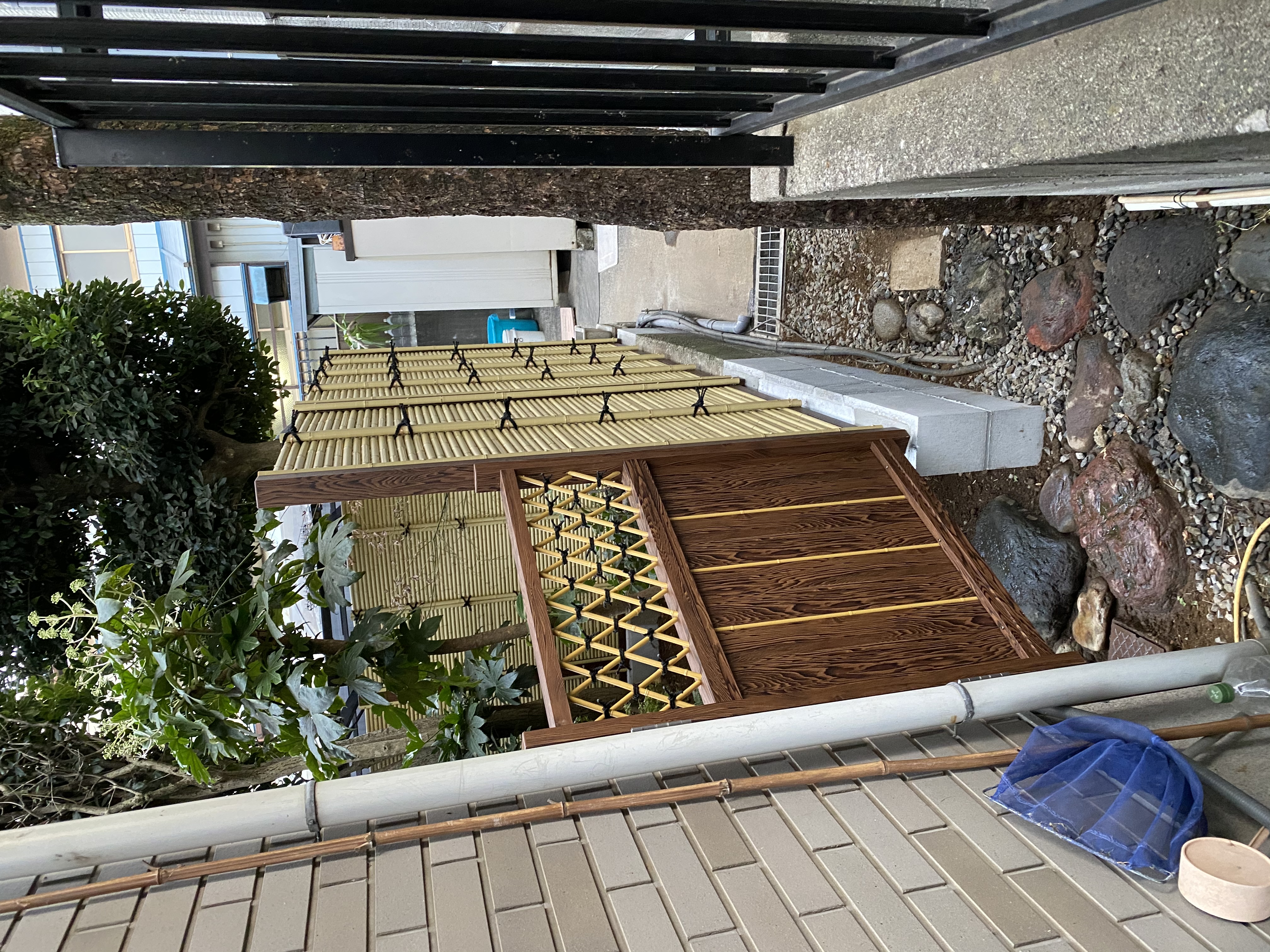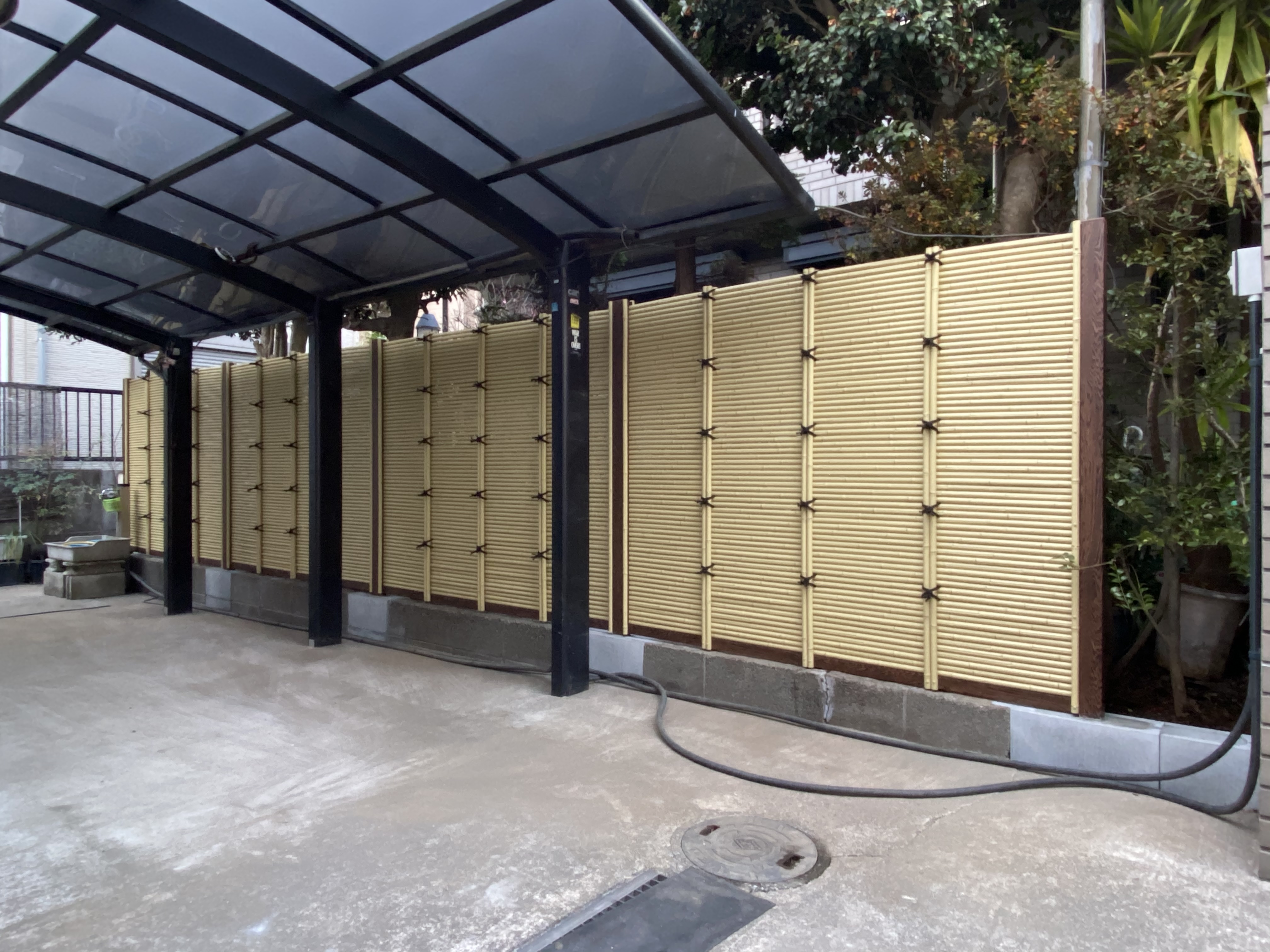 409 御簾垣工事(人工竹) 株式会社あかつき造園 十数年前に施工した天然竹垣か老朽したので、今後は手のかからない人工竹で垣根をしたい。とのご要望でした。 明るい間仕切りになったと思います。 工事期間 2021年2月施工