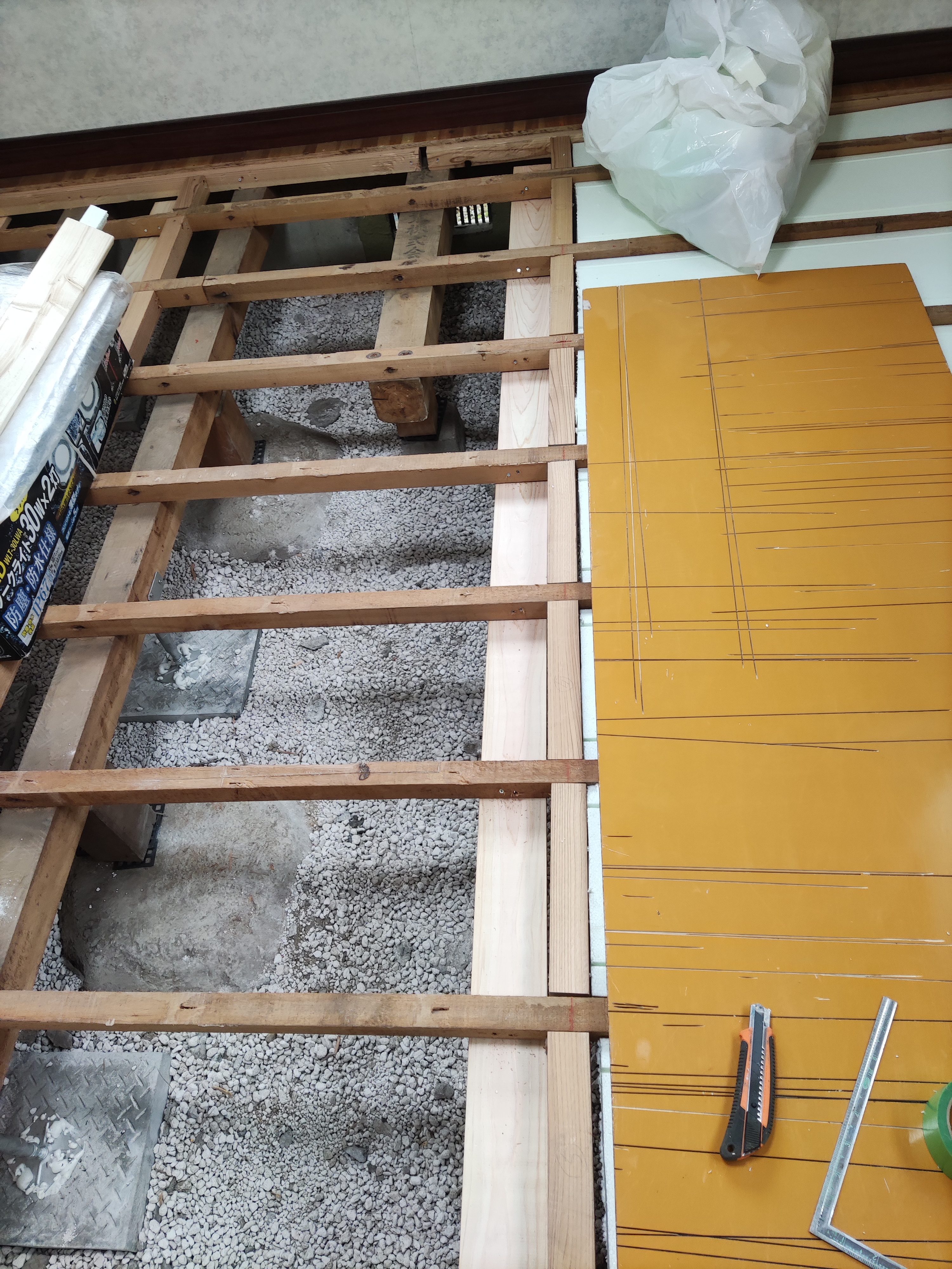 築40年の、床鳴り、たわみのフローリングの張替と、タイルカーペットの敷き詰め工事です。使用床材 東洋テックス ダイヤモンドフロアー AAシリーズ