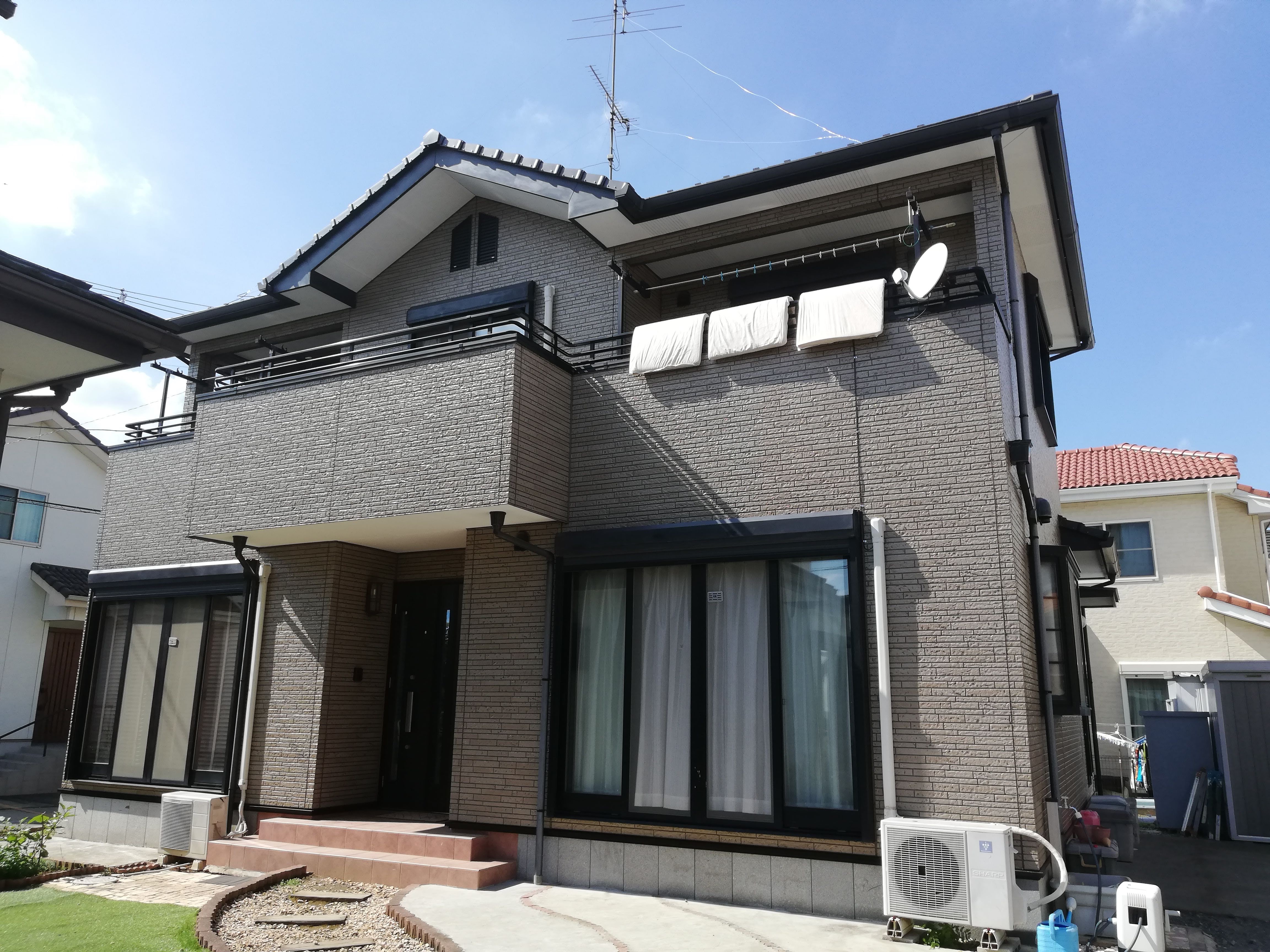 私のお客様からの紹介現場です。新築当初の壁の柄が気に入っておられたので、クリアー塗装をしました。 使用塗料 SK化研プレミア厶UVクリアー フッ素使用。