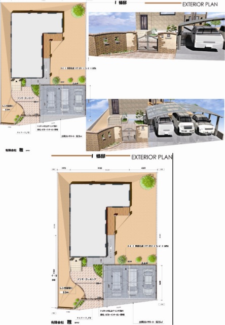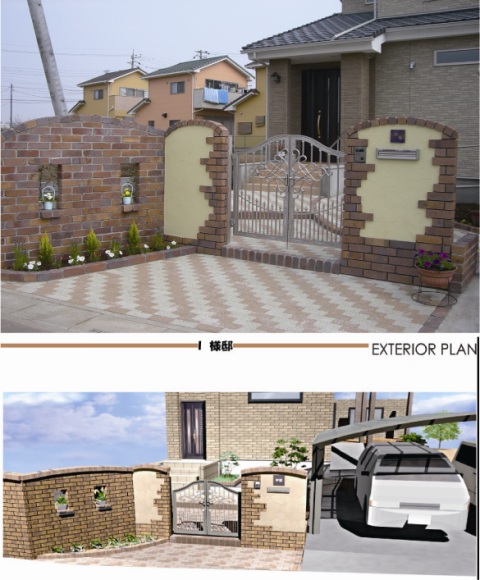 レンガ壁積み 門袖ー塗り壁(一部レンガ貼り)+両開き門扉 花壇 アプローチ(インターロッキング) デッキまでのアプローチ(車イスで移動できる様に)-土間コンクリートでスロープ+手すり取り付け 3台用カーポート+土間コンクリート