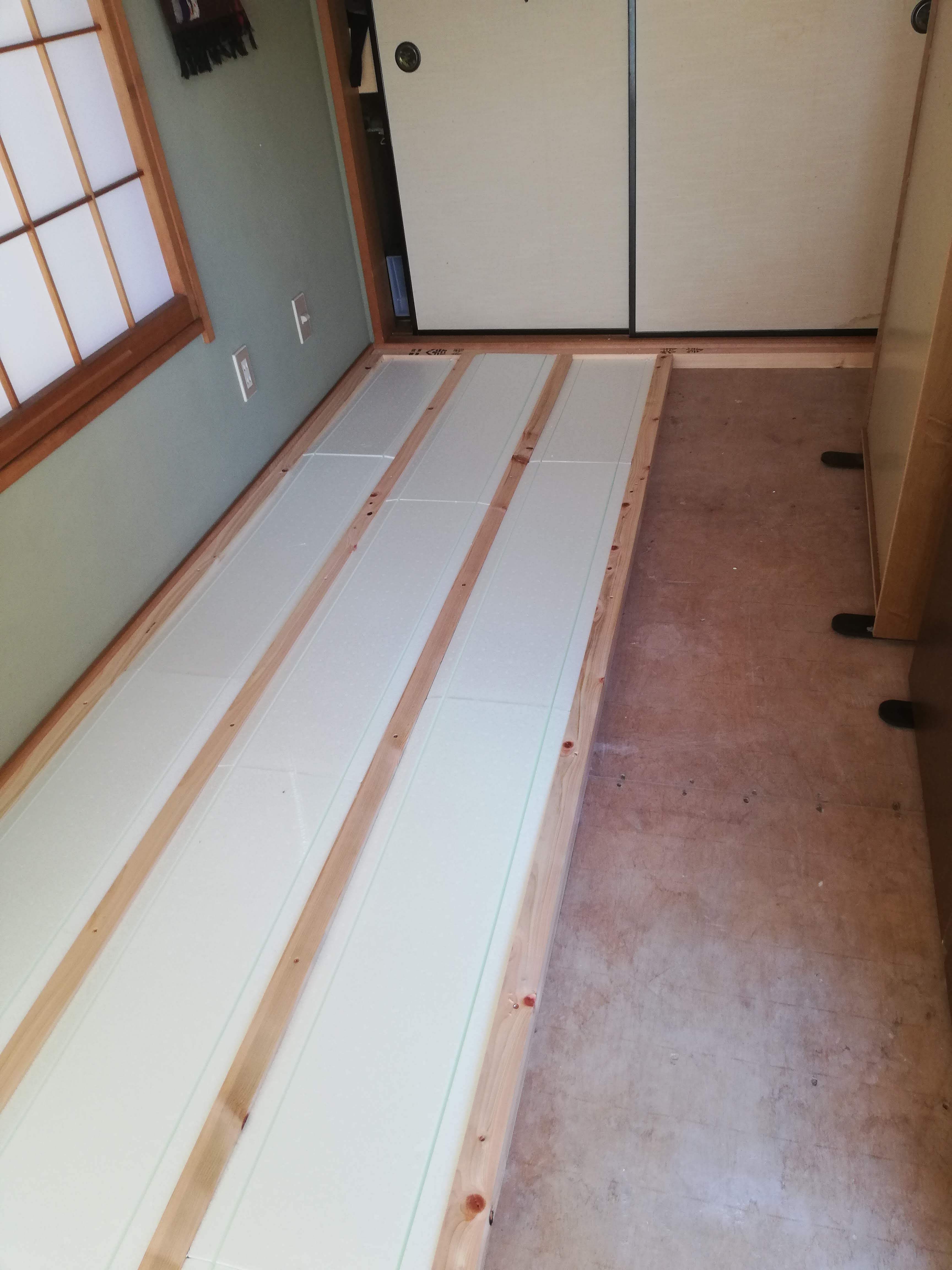 441 和室の畳からフローリングへ 根岸塗装店 畳の手入れが大変だという、お客様からのご依頼でした。近くで、私がフローリングの張替をしていた私のお客様からのご紹介でした。。 使用床材 東洋テックス ダイヤモンドフロアー AAシリーズ 既存の畳の撤去作業です。 新規の垂木根太と断熱材の施工です。 場所 埼玉県熊谷市