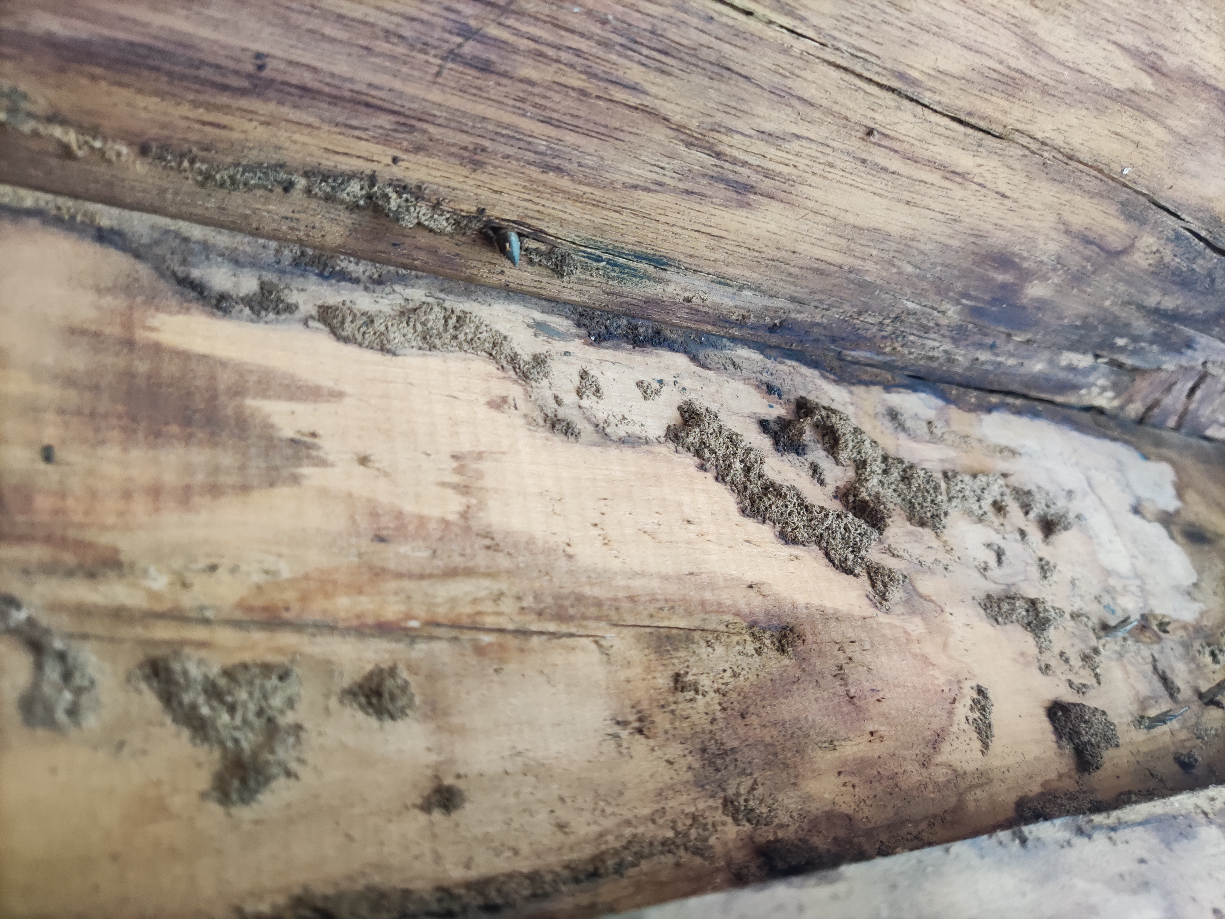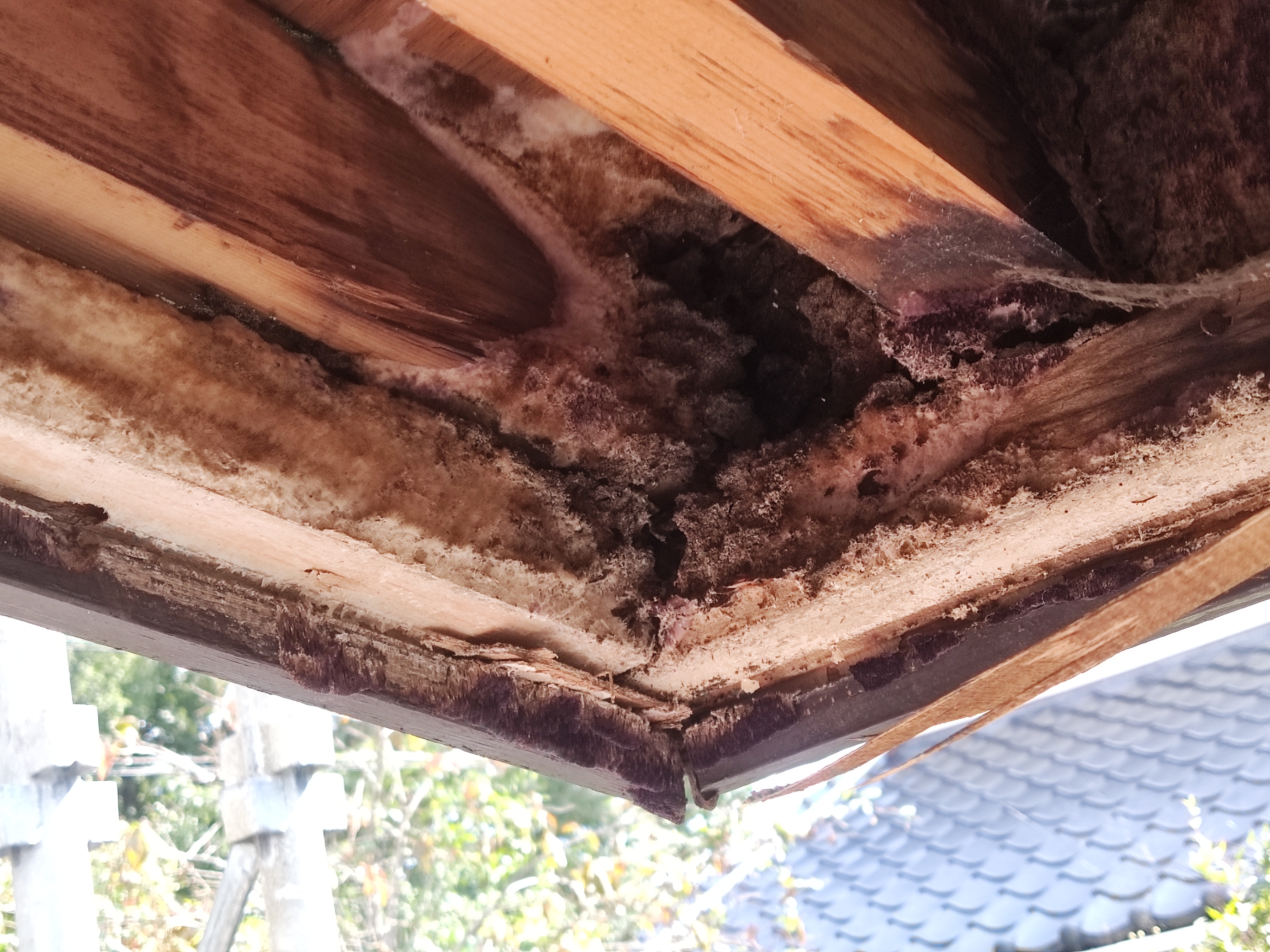 屋根からの雨漏りで、シロアリが! 軒を剥がしたら巣がありました。イエシロアリとヤマトシロアリがいますが、これはヤマトシロアリです。水気があれば何処にでも巣を作る厄介な生き物です。