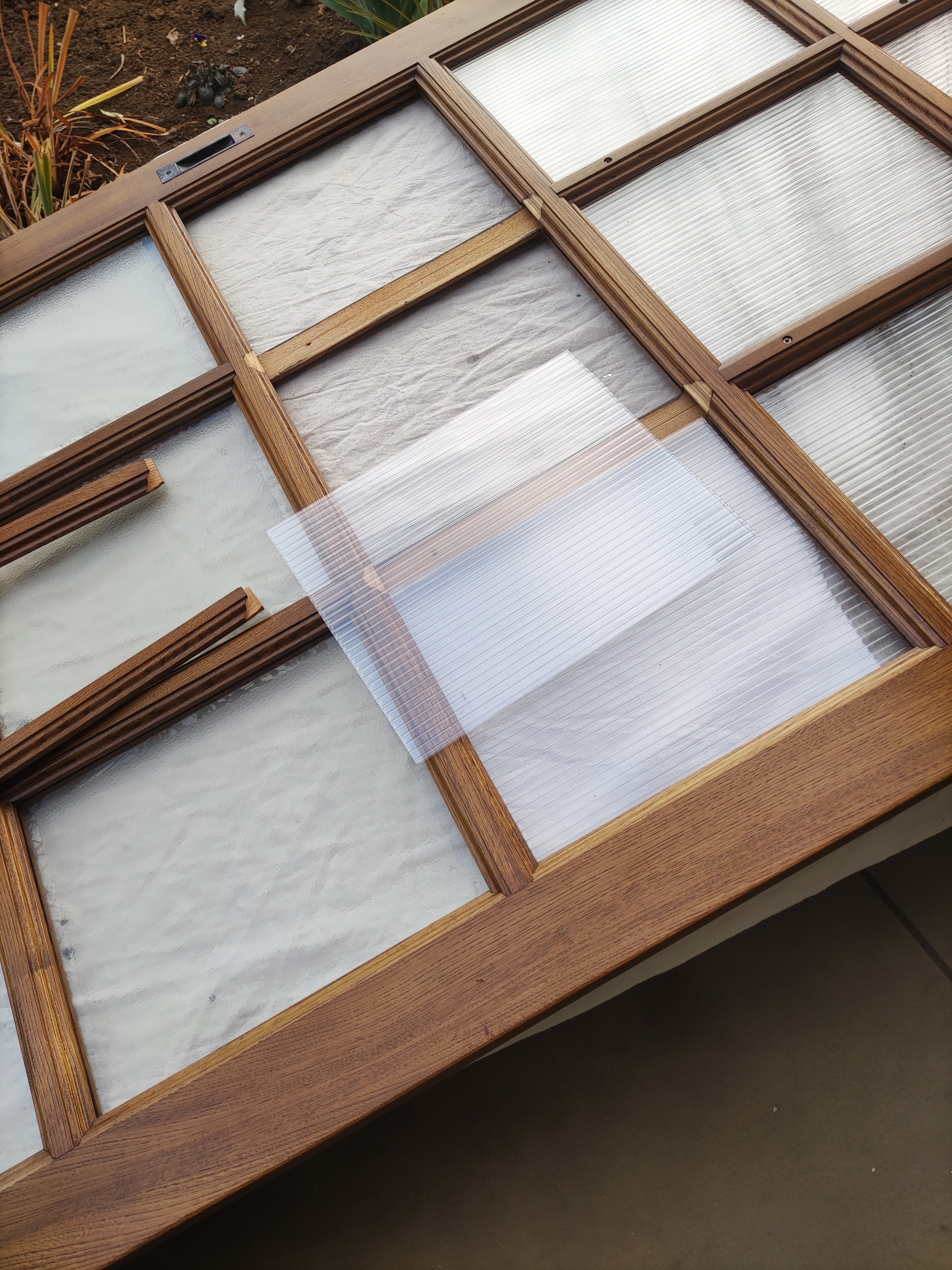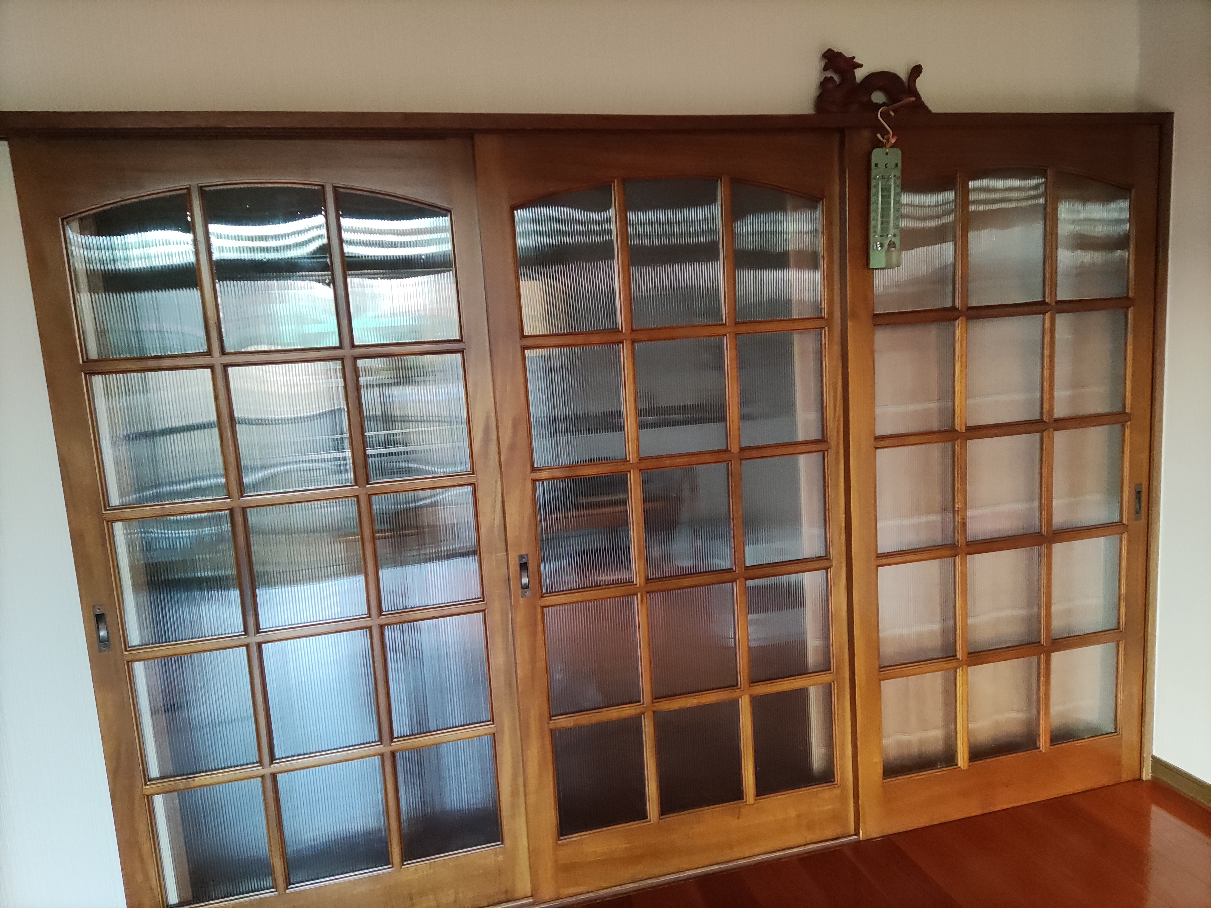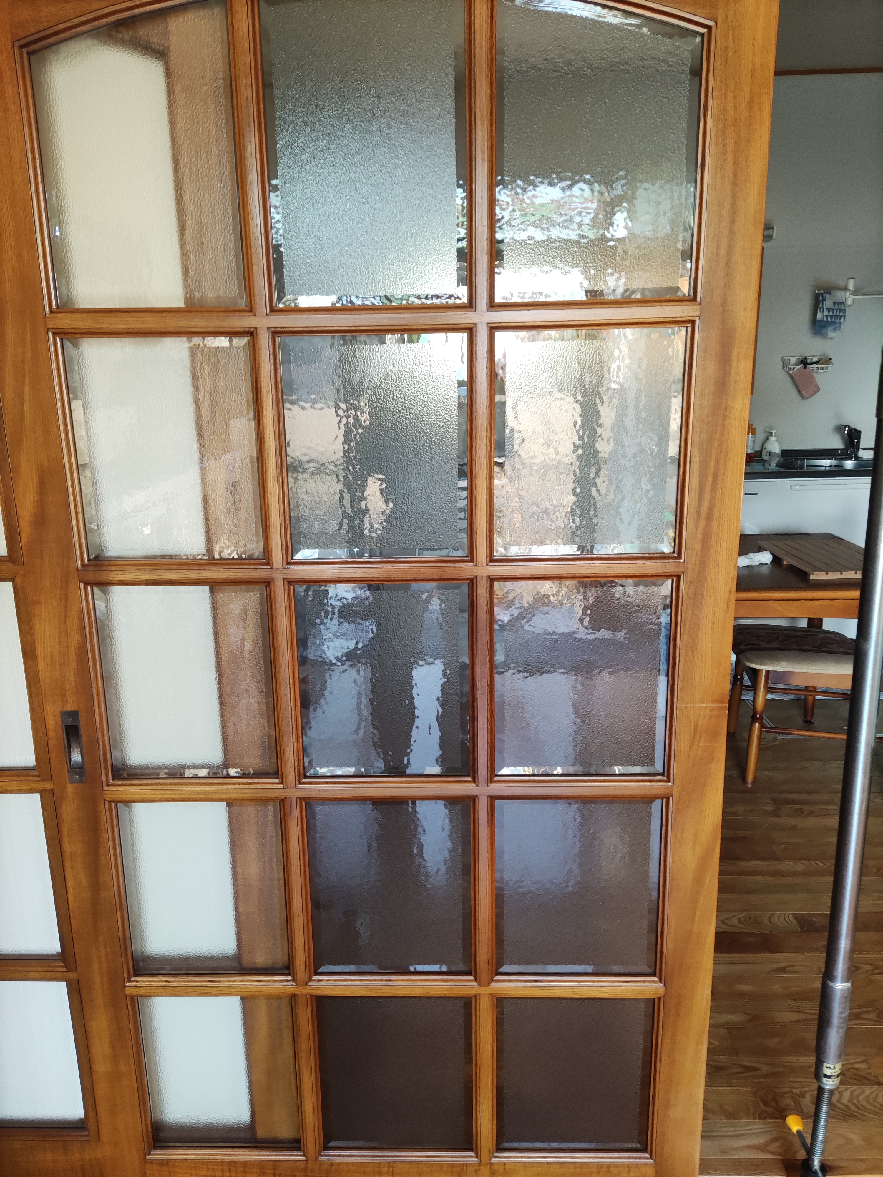 520 引き違い戸のガラスをポリカに取替え。 根岸塗装店 ガラス使用の引戸が重たいのと、危険と言う相談を受けて、ポリカ中空ボードに取替え。 ポリカ交換前 ガラスを外しボリカ中空ボードに 場所 埼玉県川越市