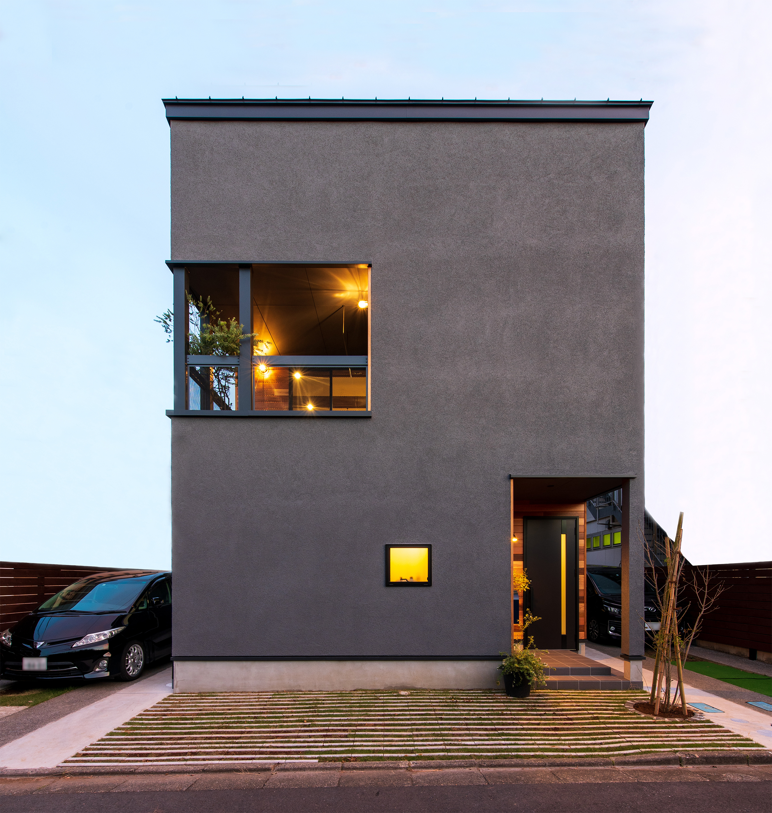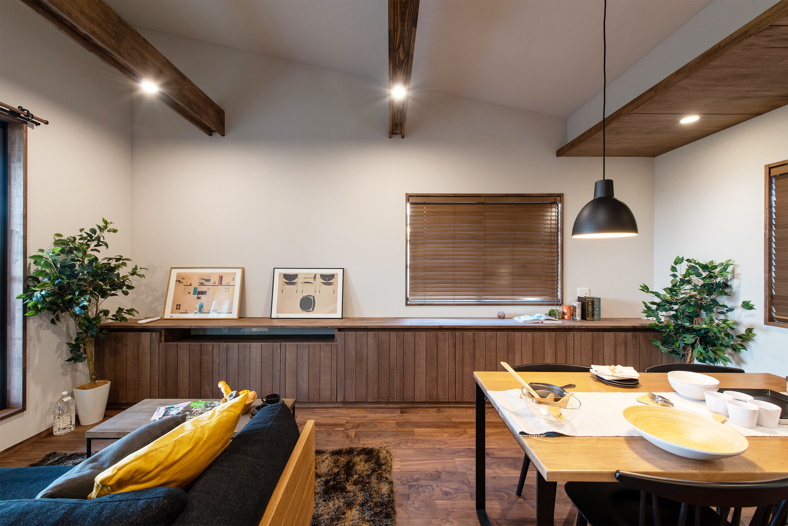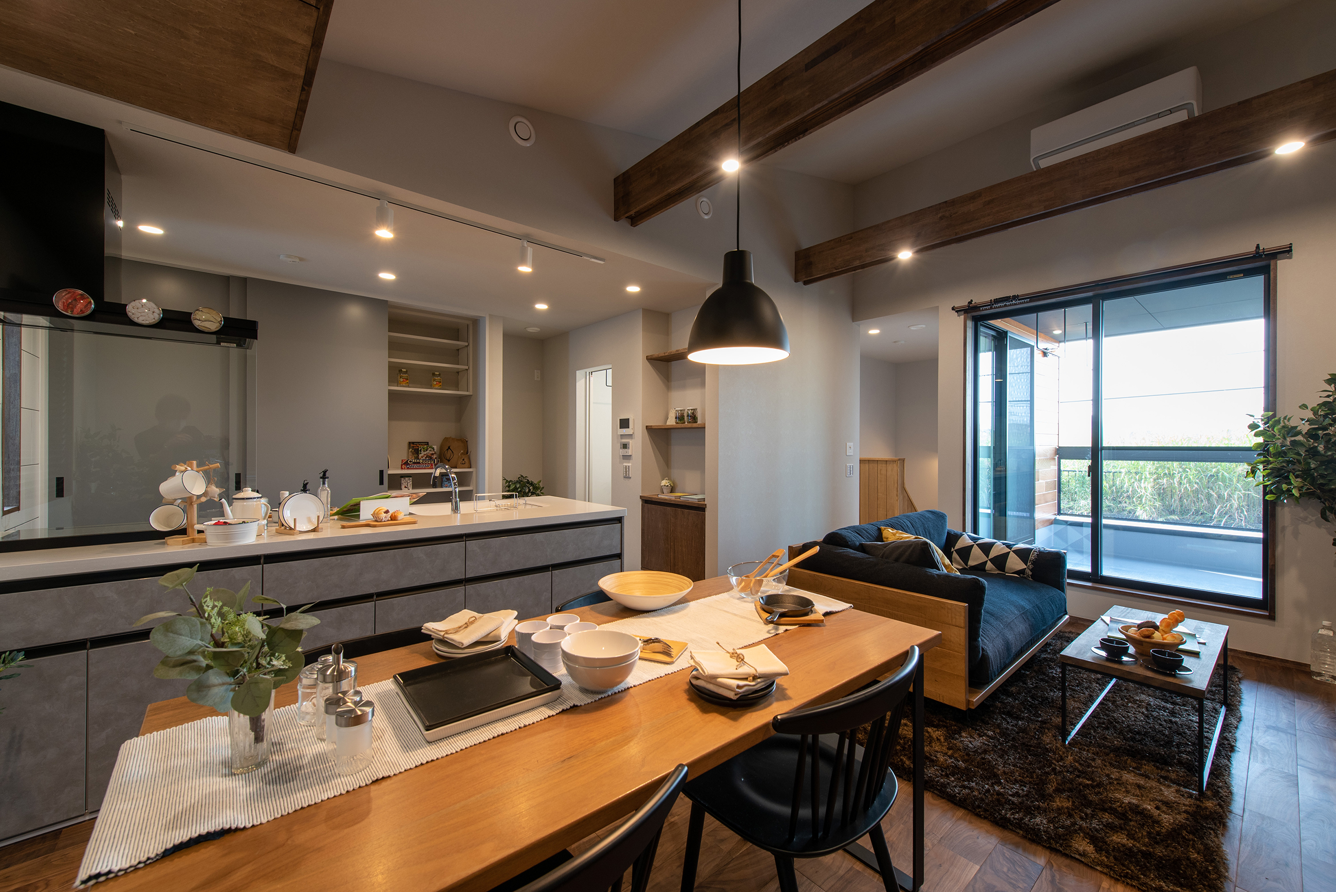 堤防沿いの開放的な立地を最大級に愉しむインナーバルコニー。2階に設けた大空間のリビングは家族のコミュニケーションがとれる素敵な空間。1階にベットルームをまとめ、2階は生活の中心となる水廻りを整えて使い勝手のいい間取り。素足でもいい気持ちいい無垢フローリング。自社大工が造るオーダーメイド家具。