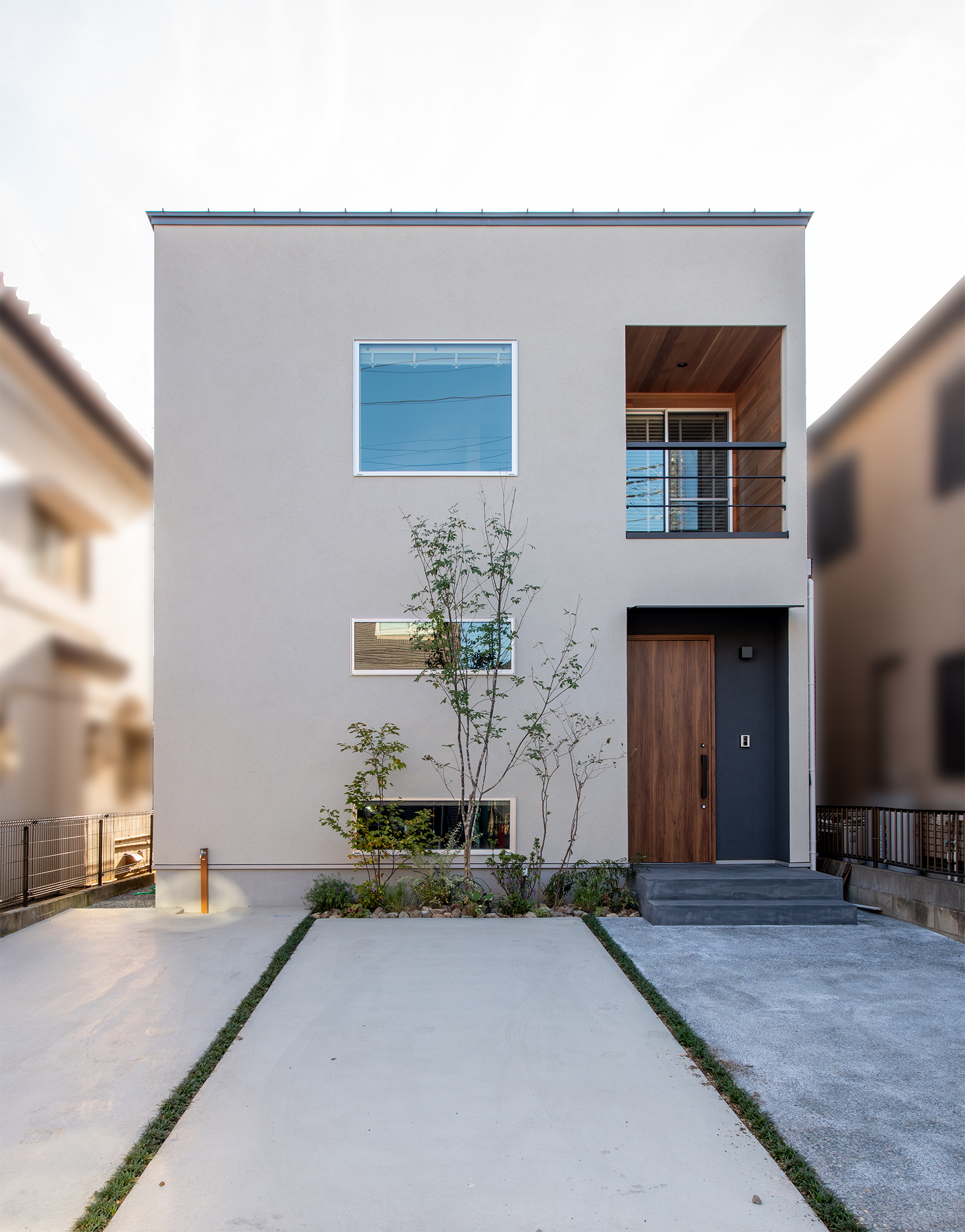 白の塗り壁に包まれた外観