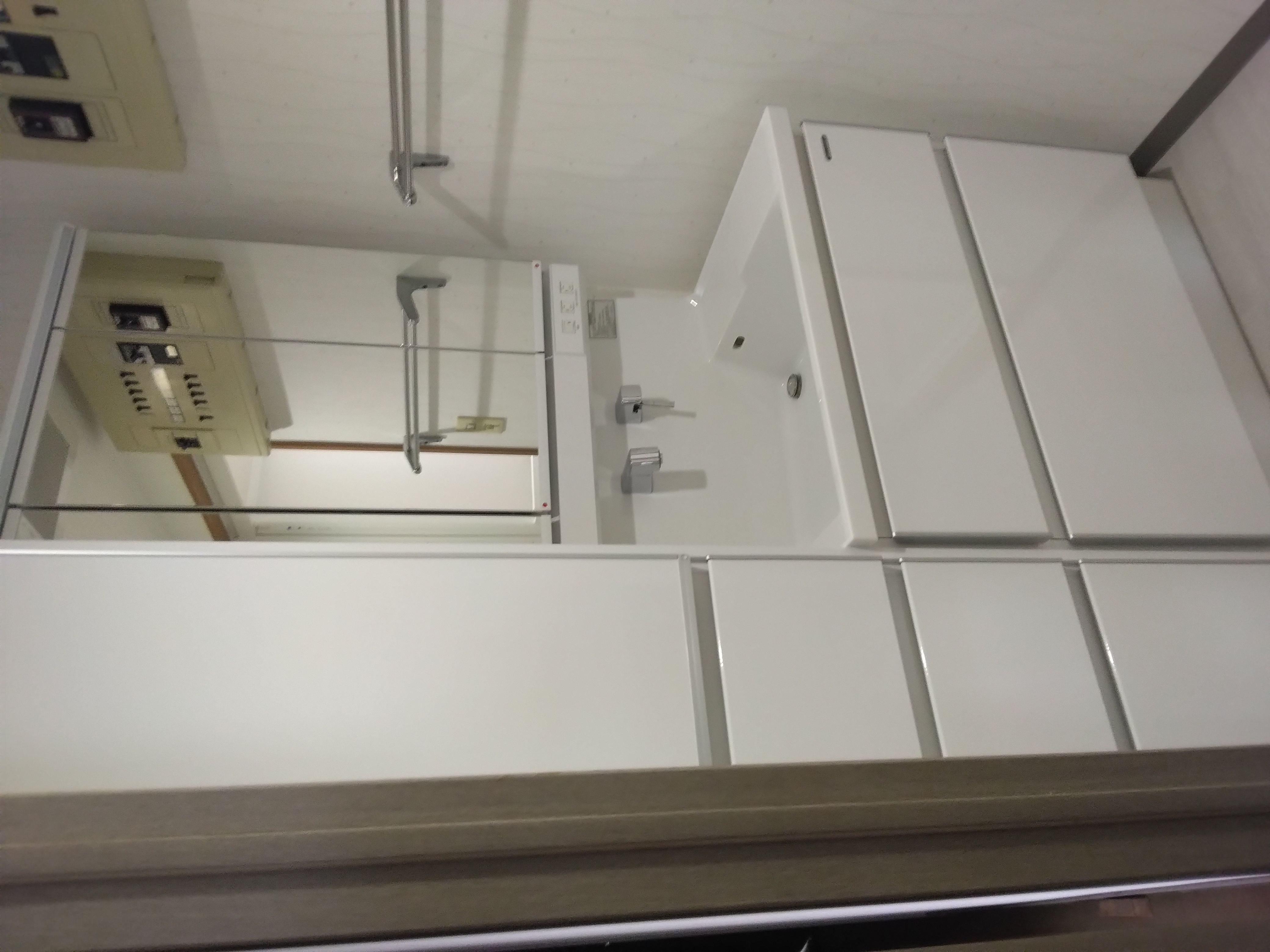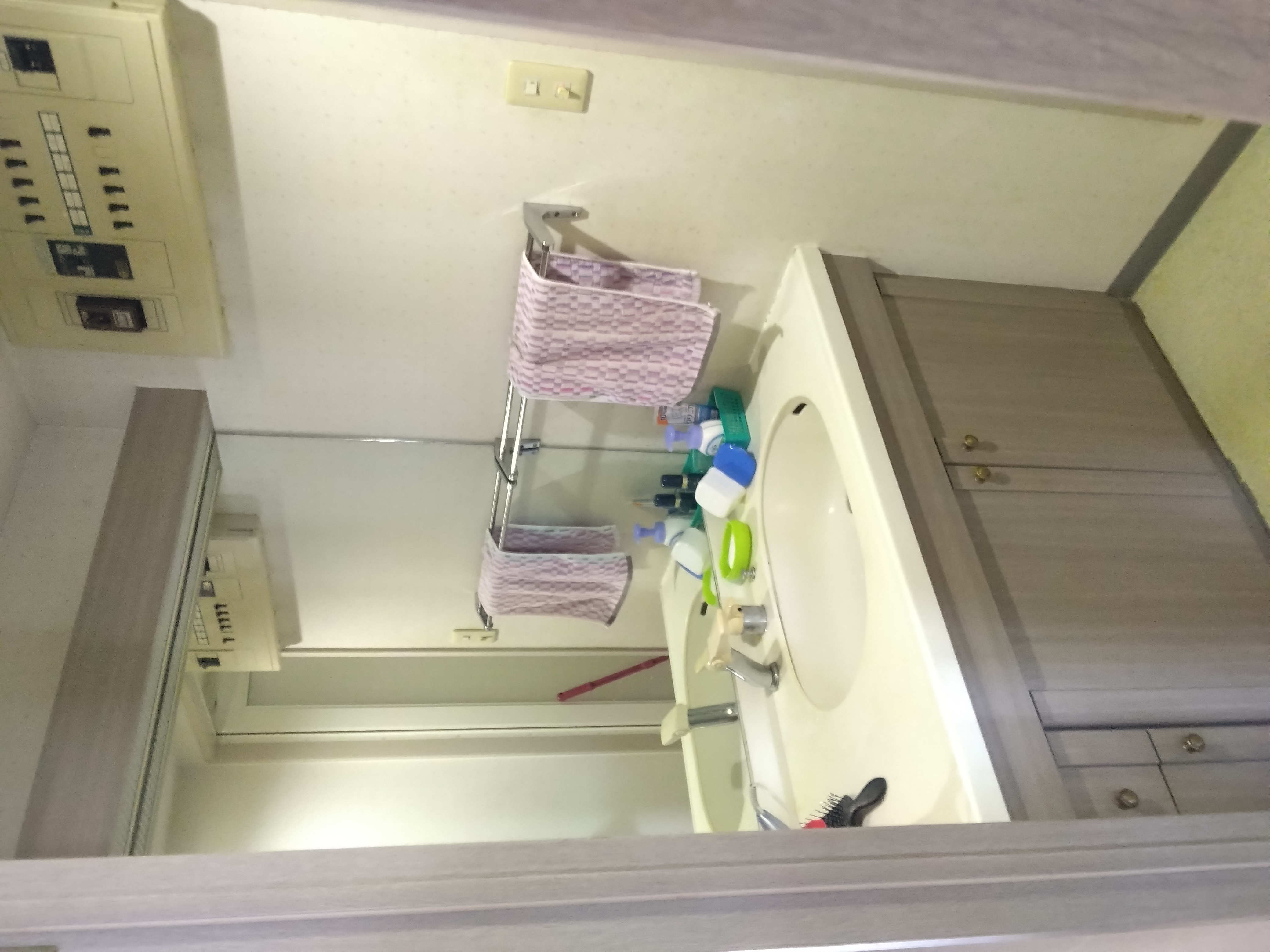 543 洗面化粧台改修工事 (有)本山企画 以前の場合、鏡が壁面に1面タイプで収納も下のみでしたが、3面鏡(収納付)と下スライド2箇所とサイドに収納棚を付けた事で、何倍も収納スペースが増えました。シンクも返しがないので、掃除がしやすくなりました。 改修前 解体後