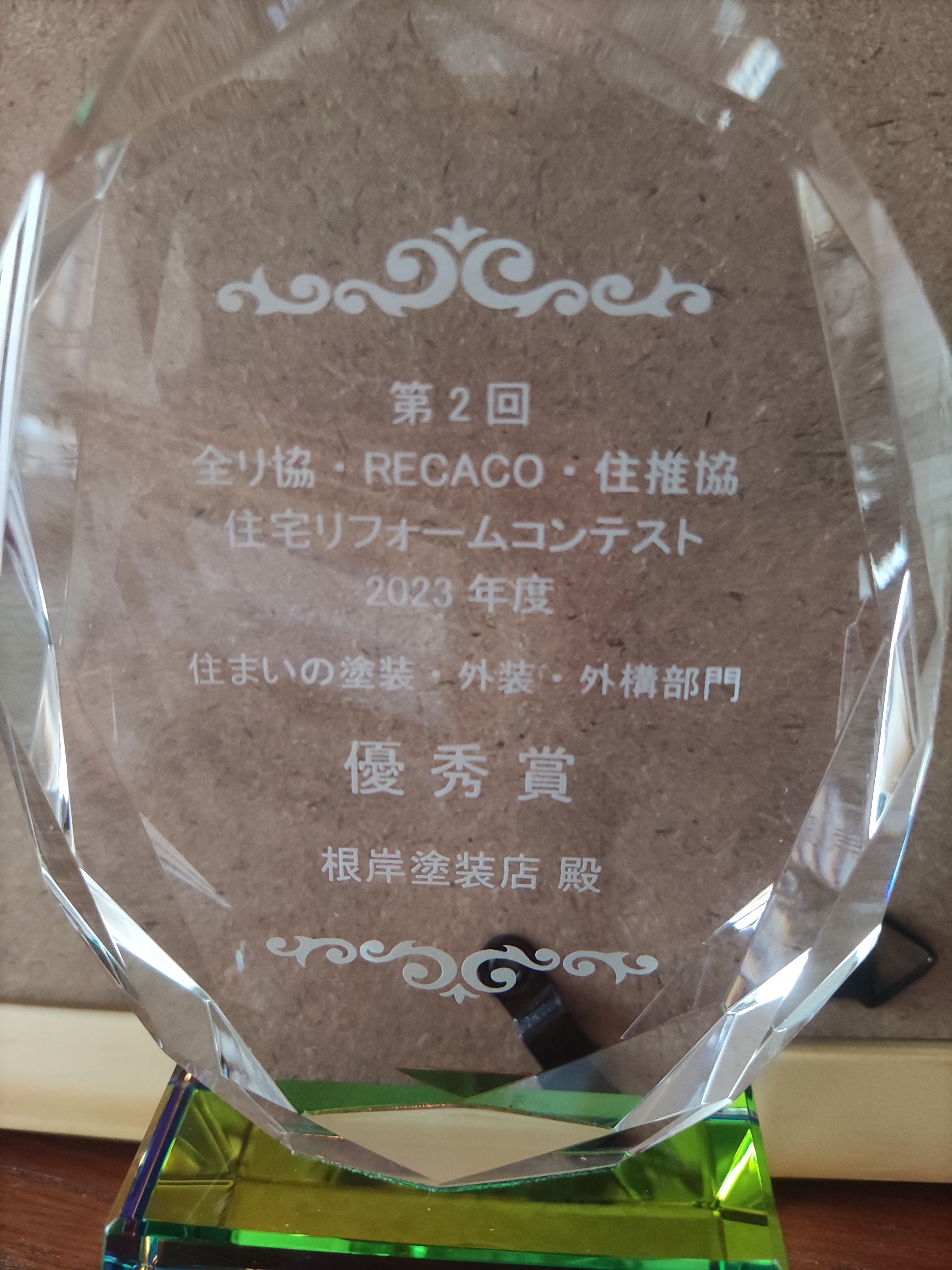 593 第2回リフォー厶コンテスト優秀賞受賞 根岸塗装店 外壁塗装の際、雨樋を外して塗装する事が評価されました。 記念品です。 補足事項 これからも、地域密着、お客様に感謝される塗装を含めたリフォー厶を邁進してまいります。