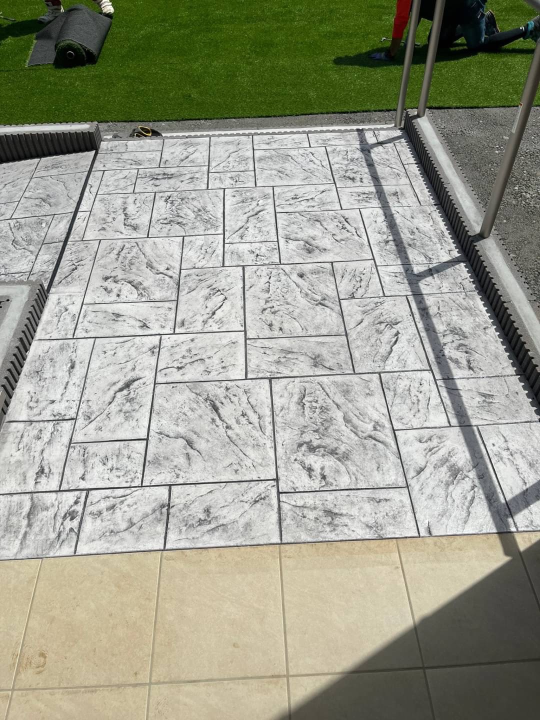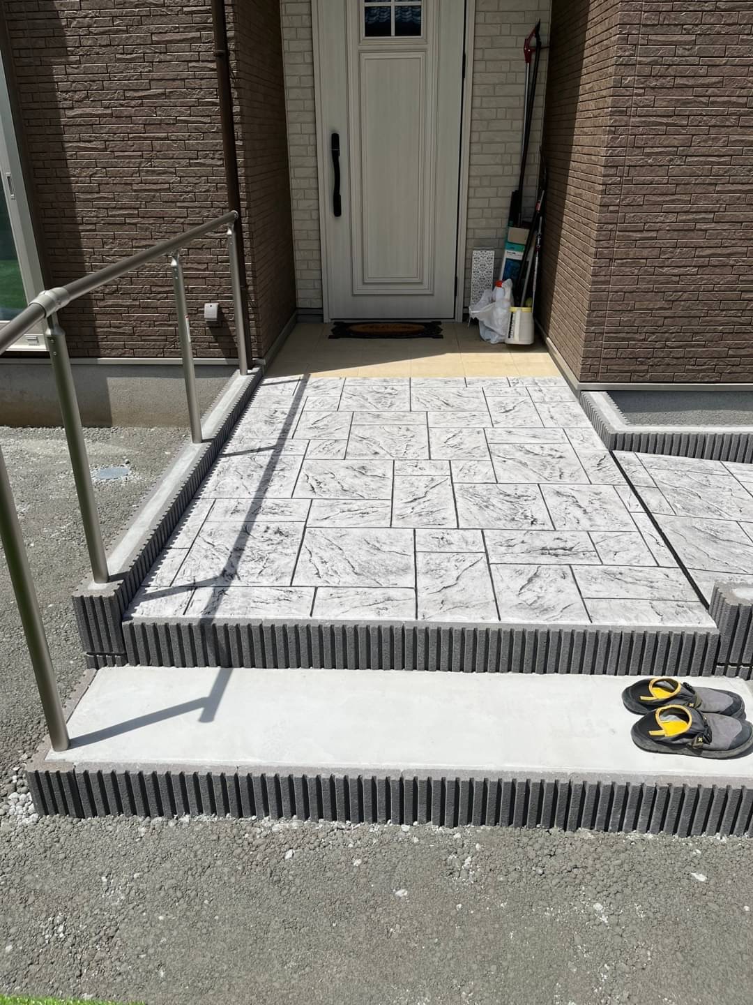 注目すべきは、玄関までのスロープ!! 「スタンプコンクリート」というコンクリートの表面に模様となる型を押し付け、 着色を施すことで、自然石やレンガといった他の素材そっくりに仕上げる工法を実施しました(#^^#)