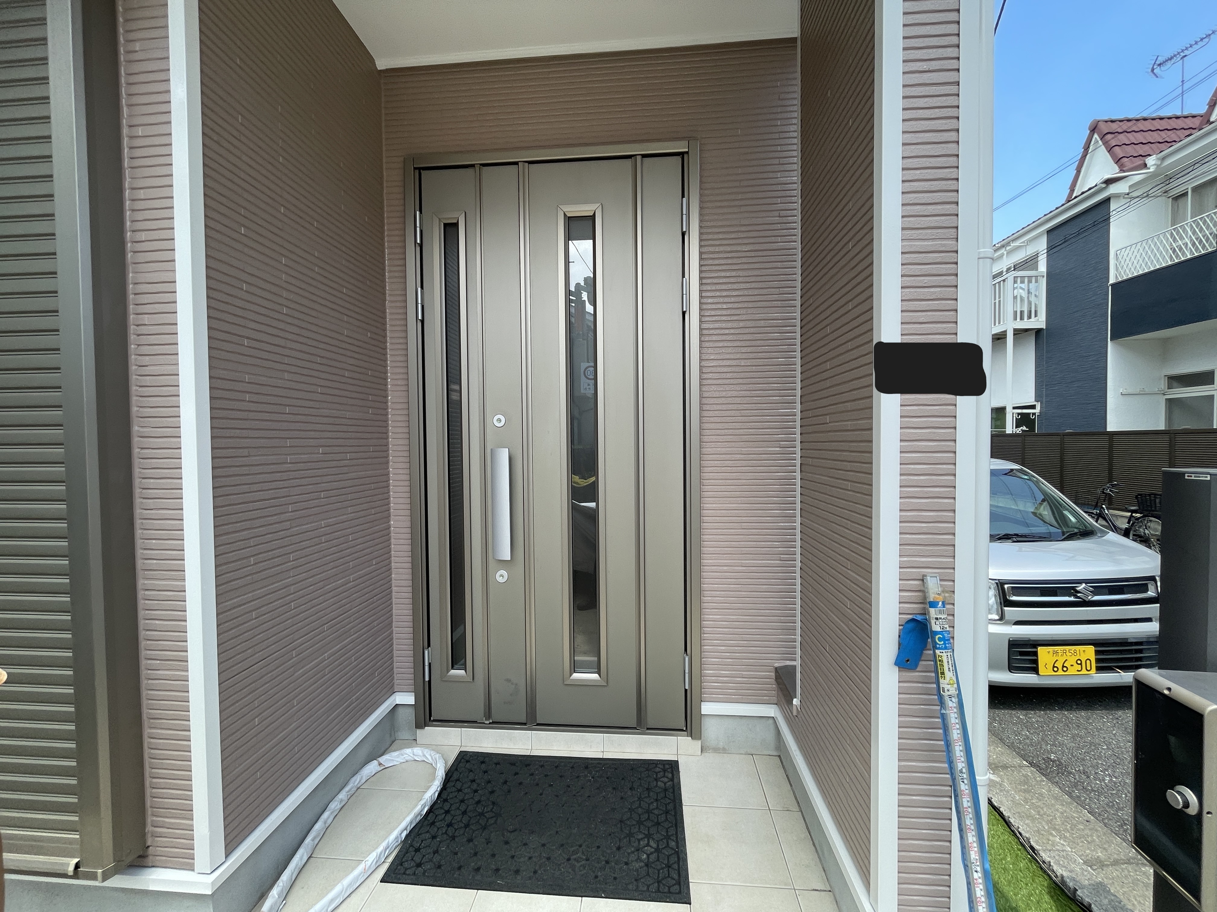 玄関ドアの表面が紫外線や物を擦ったりして、ダメージを受けていたのできれいにしたいとのご希望から玄関カバー工事をご提案させていただきました。