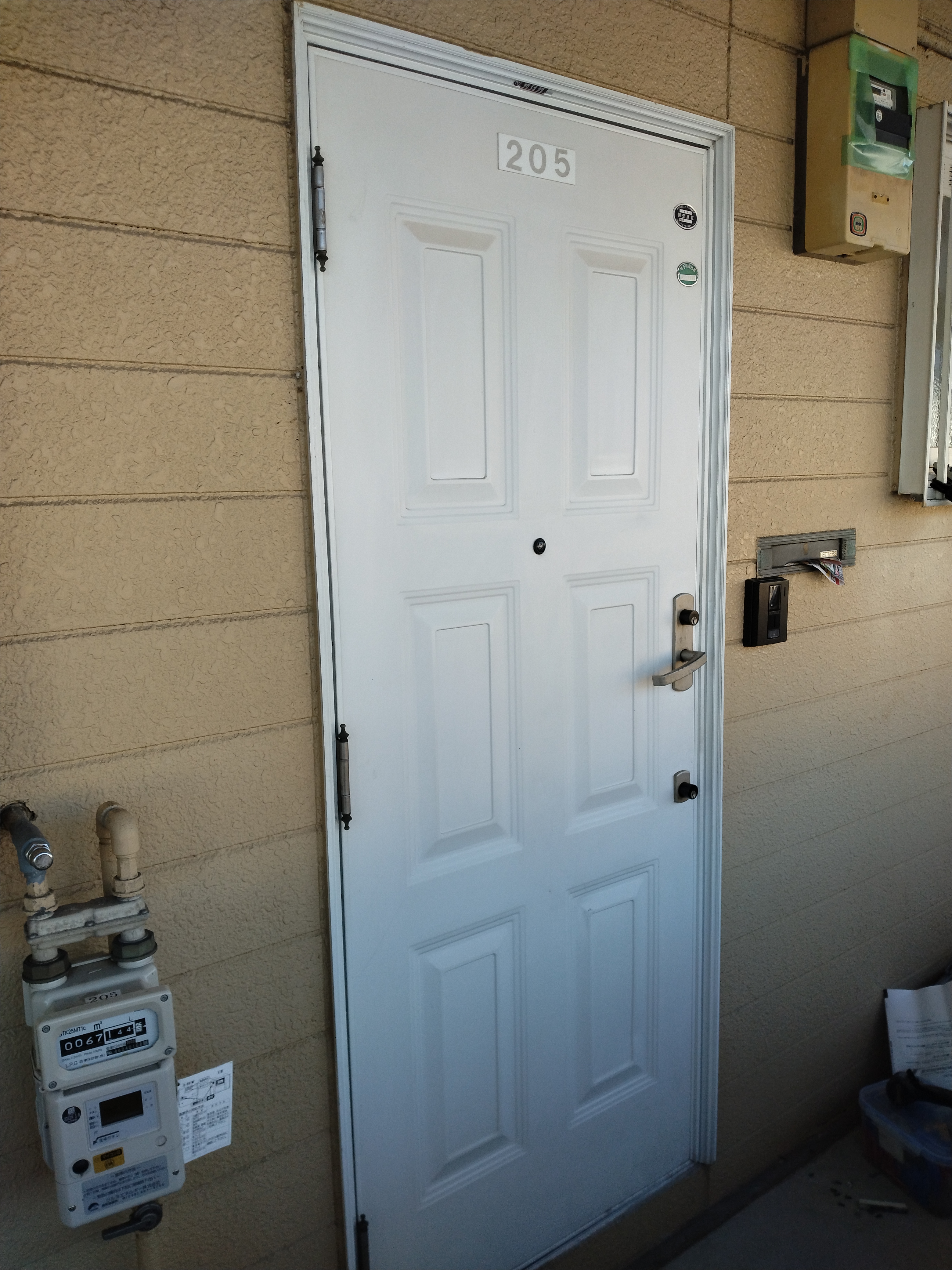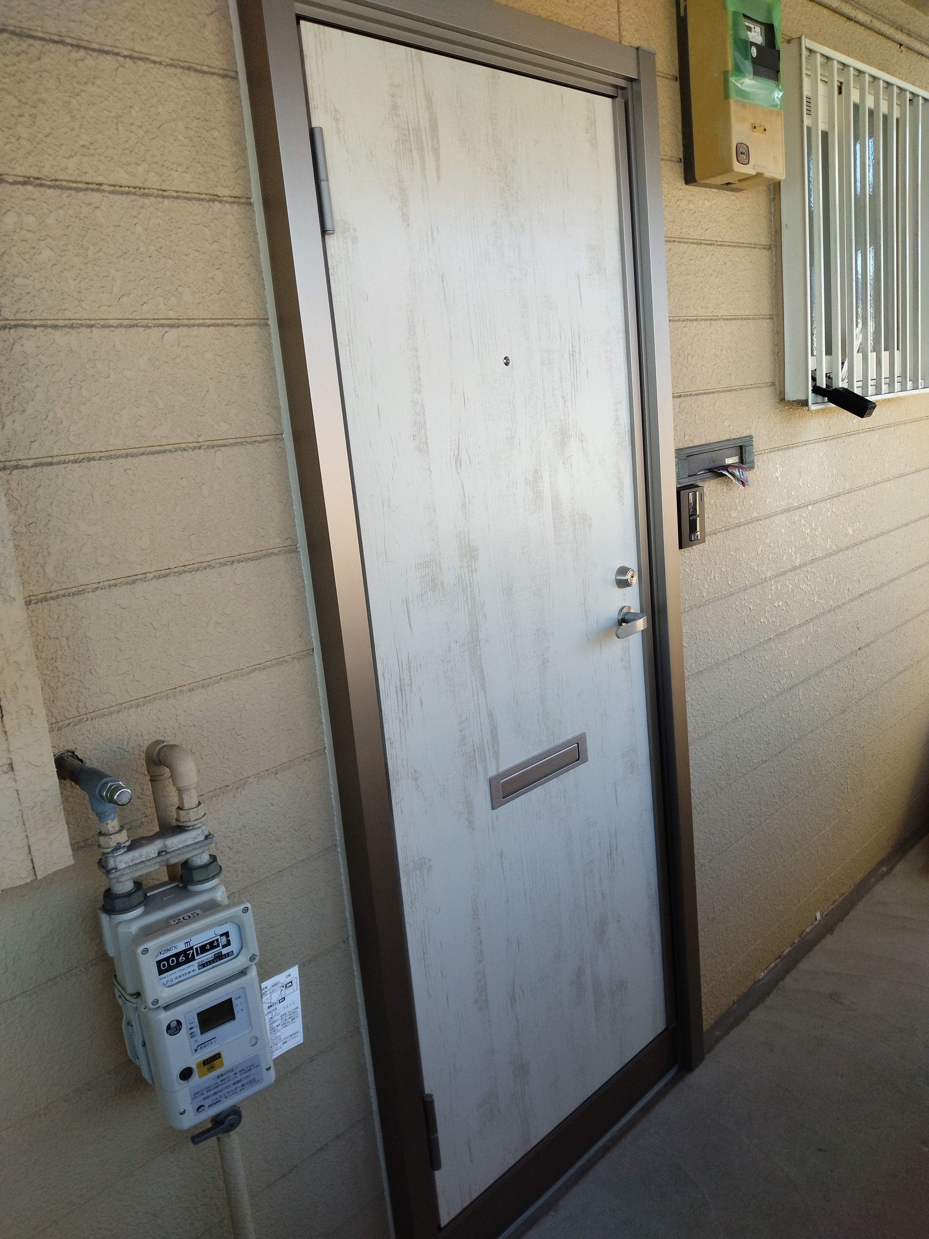 680 さいたま市アパート玄関ドア交換工事 上原アルミ工業 たてつけが悪く、鍵が掛かりづらくなっていたドアをアパート用のリフォームドアに交換。隙間風が多かったドアが、気密性の高いドアに生まれ変わりました。 施行前