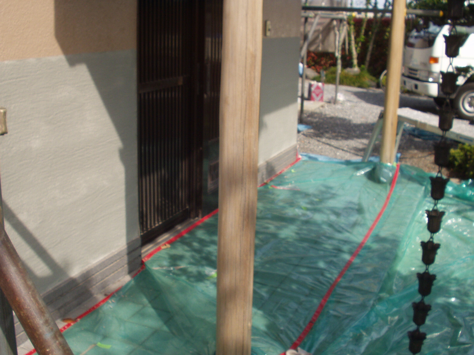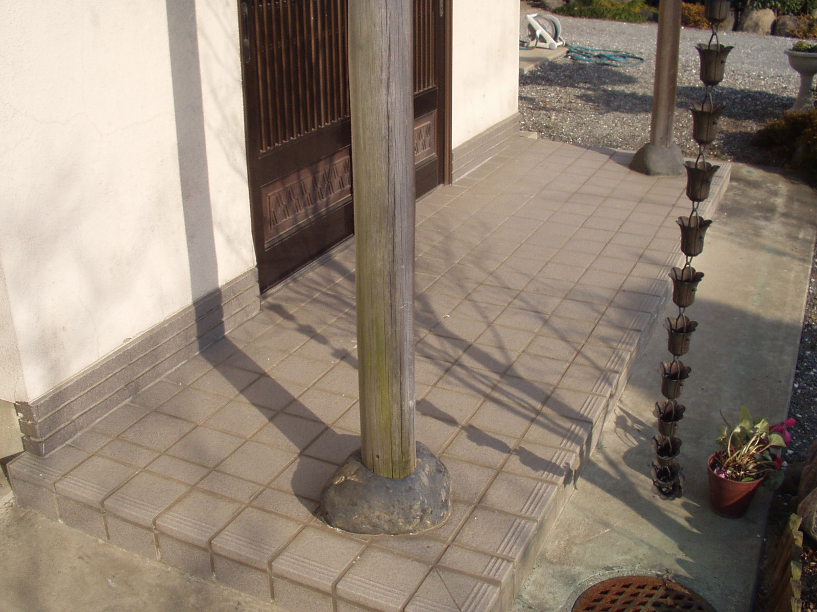 686 熊谷市 S様邸 外壁改修工事 (有)小野ペイント工業 外壁の塗り替えをさせていただき、玄関の垂木や柱の黒墨が気になっていて、あく洗いと腰壁を遊び心でタイルブリックでデザイン目地にしてみました。 お客様もとても喜んでいただき、玄関前で写真撮らせていただきました。 施工前 あく洗い漂白 玄関腰壁下地カチオンを目地色にしました。