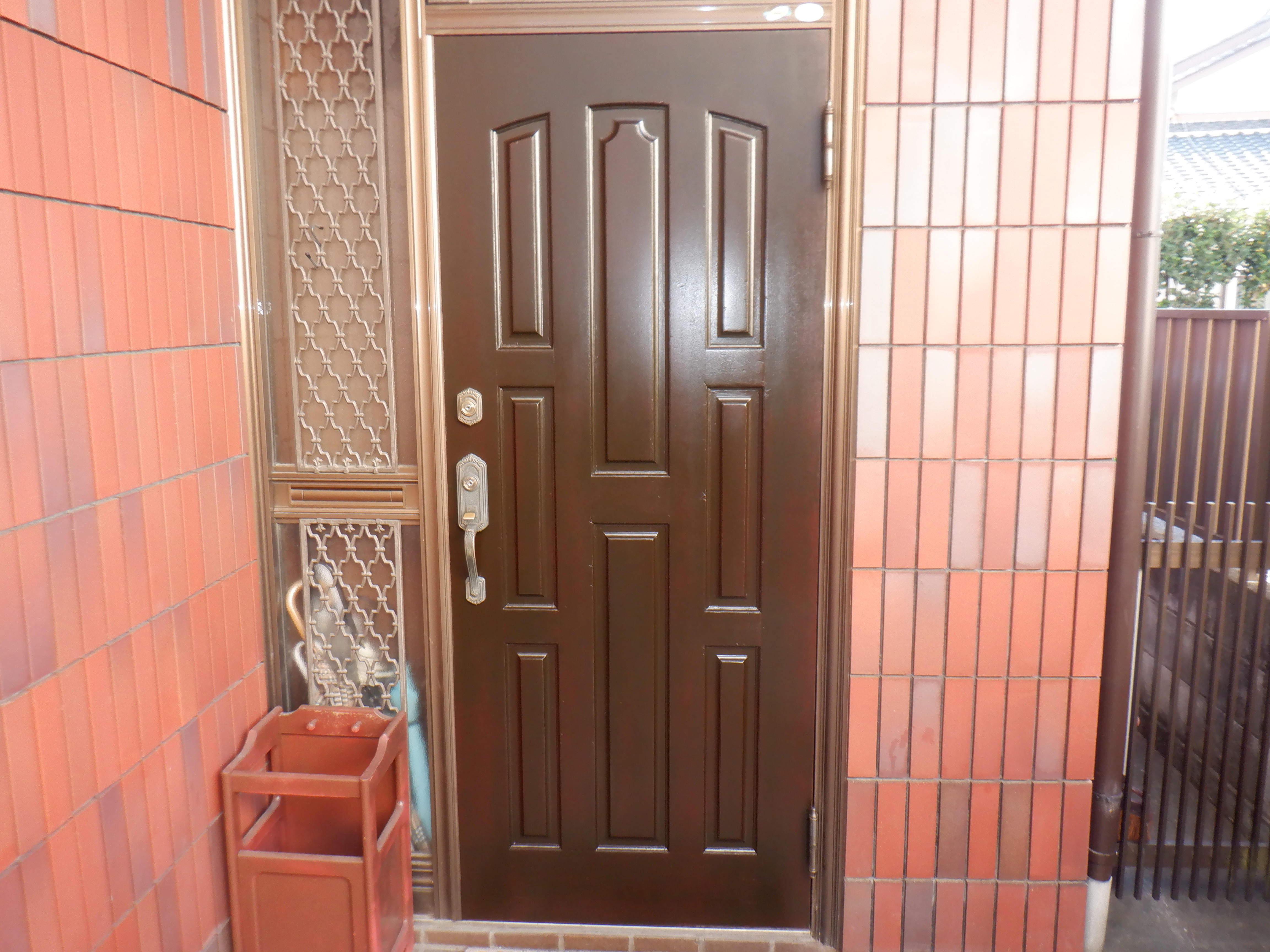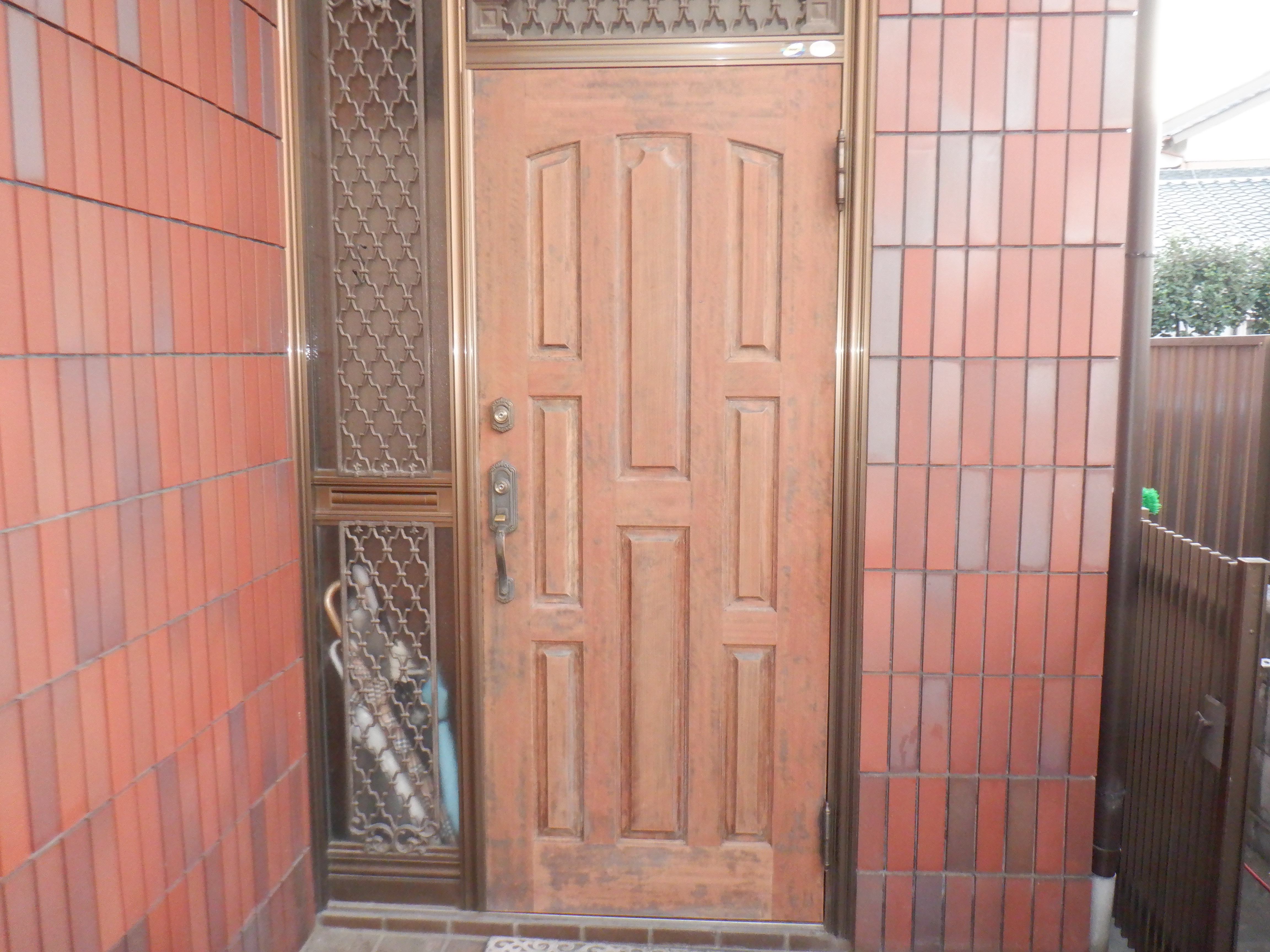 687 玄関ドアー塗装 (有)小野ペイント工業 木ドアーの塗り替え 外して剥離・素地調整して取り付けて吹き付け塗装 剥離・素地調整して取り付け 1週間後に施工 吹き付け塗装作業 仕上げまで5~6回吹きました ホットガンで強制乾燥