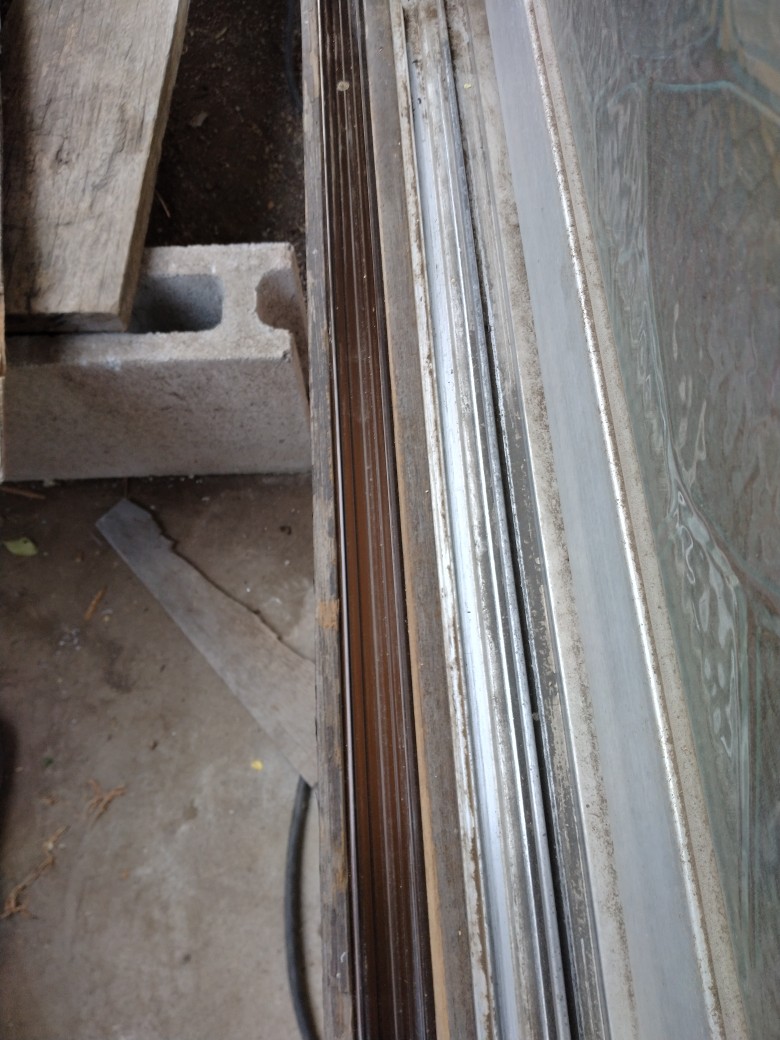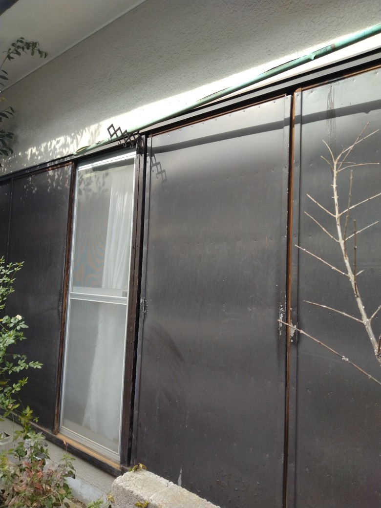 694 T様邸 雨戸交換工事 上原アルミ工業 敷居がすり減って動かなくなってしまった古いトタン雨戸の下枠にアルミレールをとりつけて新しい雨戸を入れ、スムーズに開閉できるようになりました。 新しい雨戸 リフォーム前の古くなった木枠の雨戸のレール 場所 富士見市 工事概要 雨戸交換工事