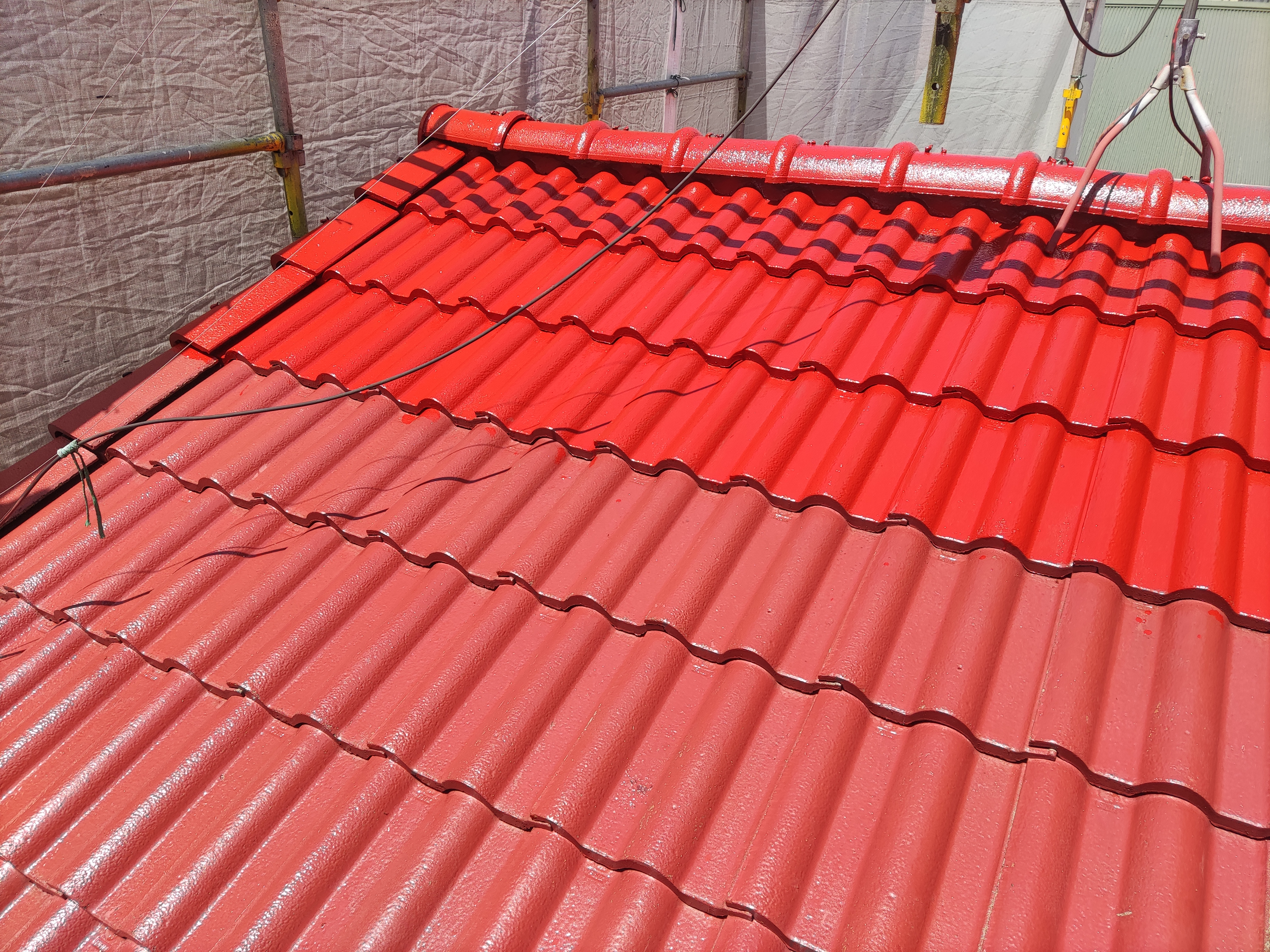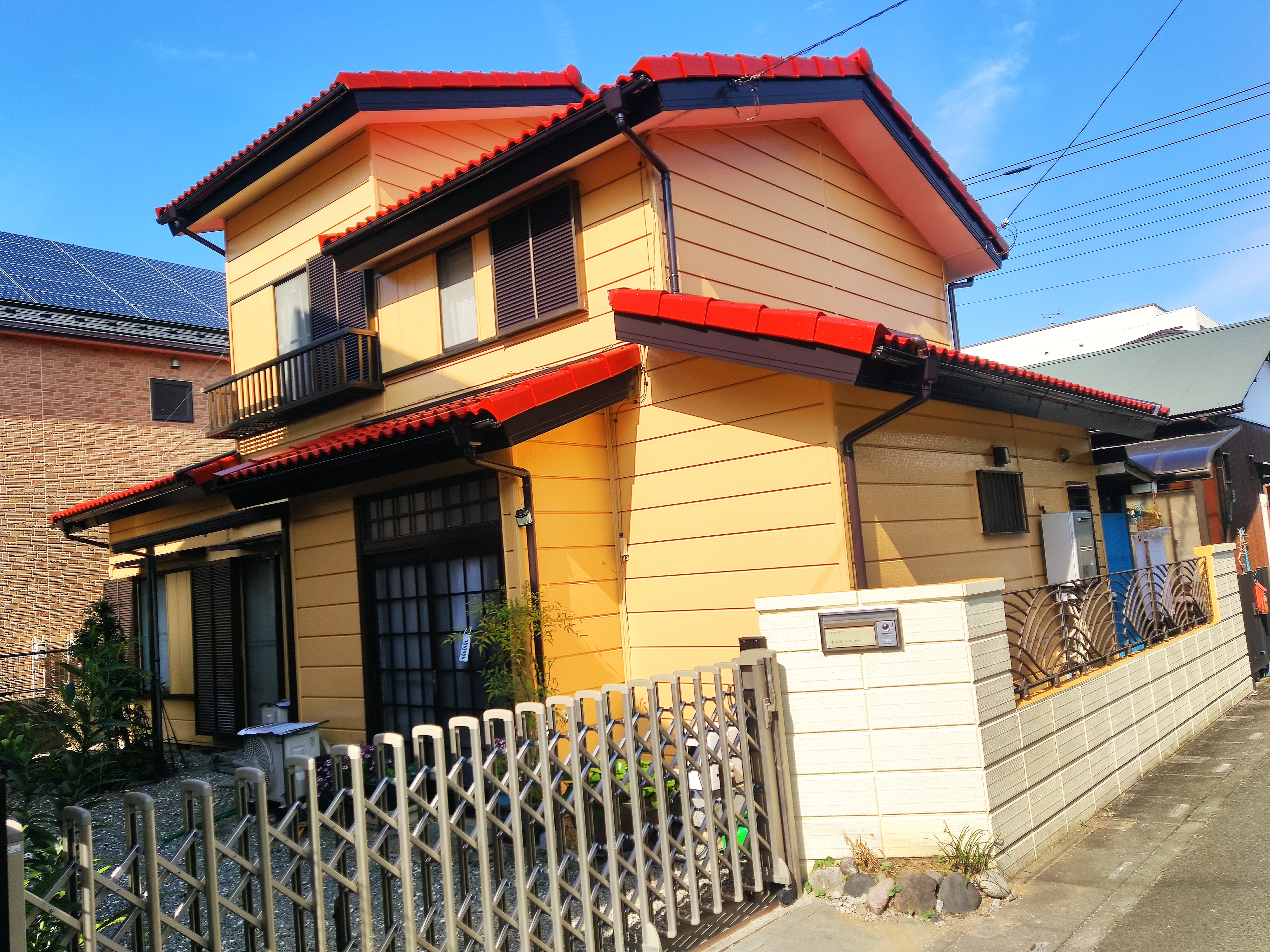 711 モダンな2色塗装 根岸塗装店 色あせたヨーロビアン瓦をベンガラ色で塗装しました。戸袋、雨戸吹付塗装 下塗り、中塗り、上塗り全て刷毛塗装 評判の良いターボリン横断幕 場所 埼玉県熊谷市 補足事項 住推協のターボリンの掲示が通行人から目を引きました。