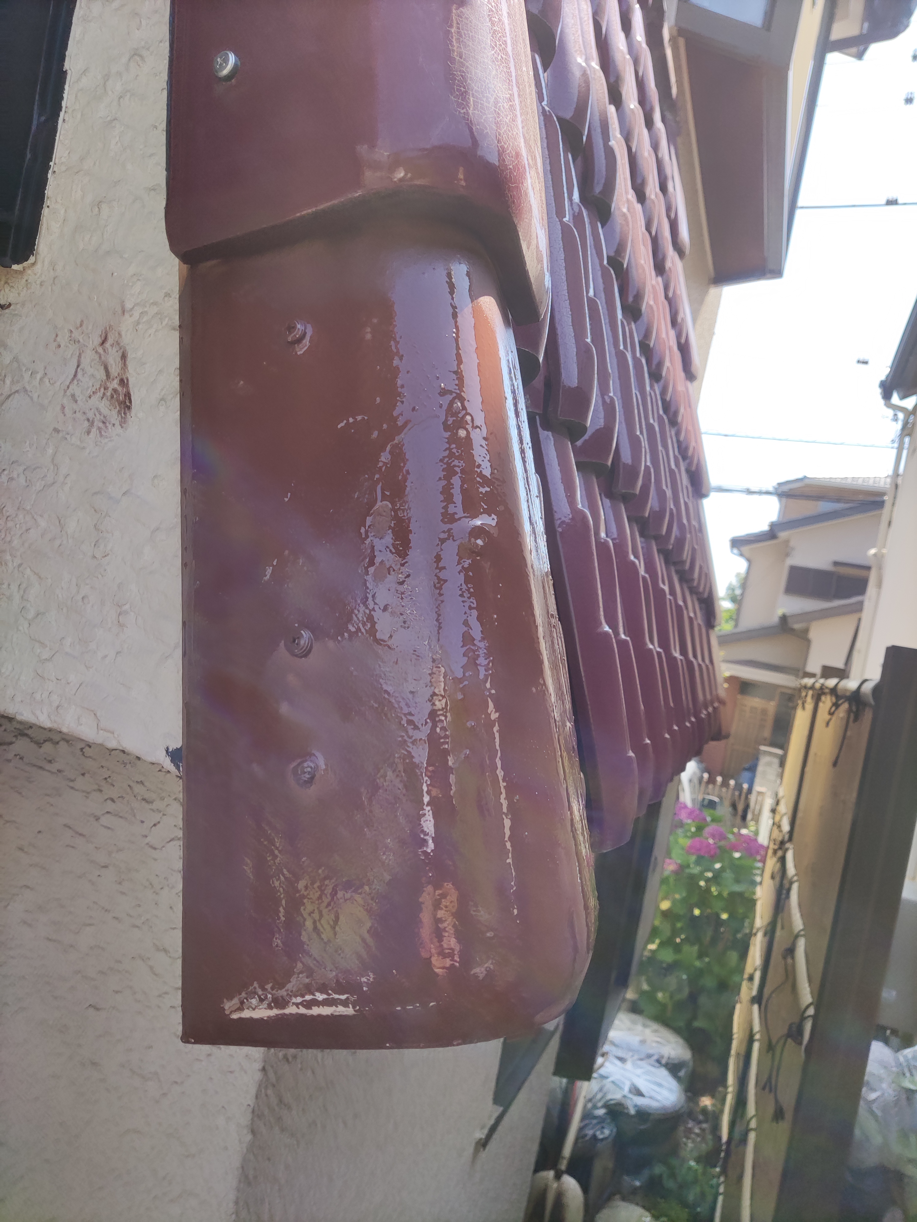 713 下の浴室に雨漏 根岸塗装店 賃貸住宅のオーナー様からのご依頼。階下の浴室の雨漏がひどいとの事でした 雨漏で役物の瓦が落下、新しい下地に交換 新しい瓦に交換 場所 埼玉県川越市 補足事項 生産中止の陶器瓦の為、やっと無塗装の瓦を入手、雨漏を止めました