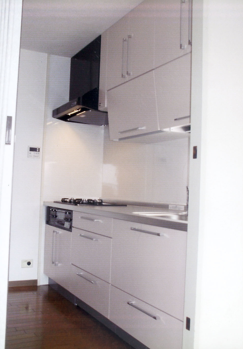 施工後 収納スペースが断然増え、調理スペースも広くなったシステムキッチン。おそうじラクラクの鏡面パネルで、毎日のお手入れも簡単です。